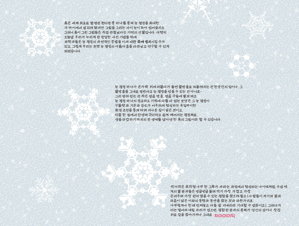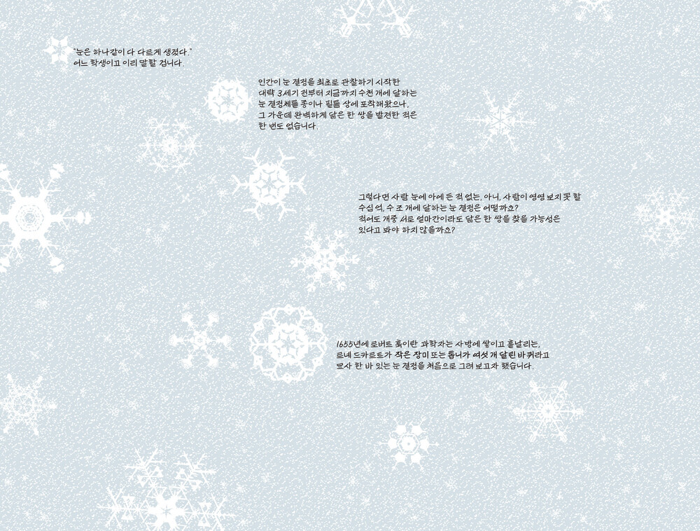 “인간이 눈 결정을 최초로 관찰하기 시작한 대략 3세기 전부터 지금까지 수천 개에 달하는 눈 결정체를 종이나 필름 상에 포착해왔지만, 그 가운데 완벽하게 닮은 한 쌍을 발견한 적은 한 번도 없습니다.