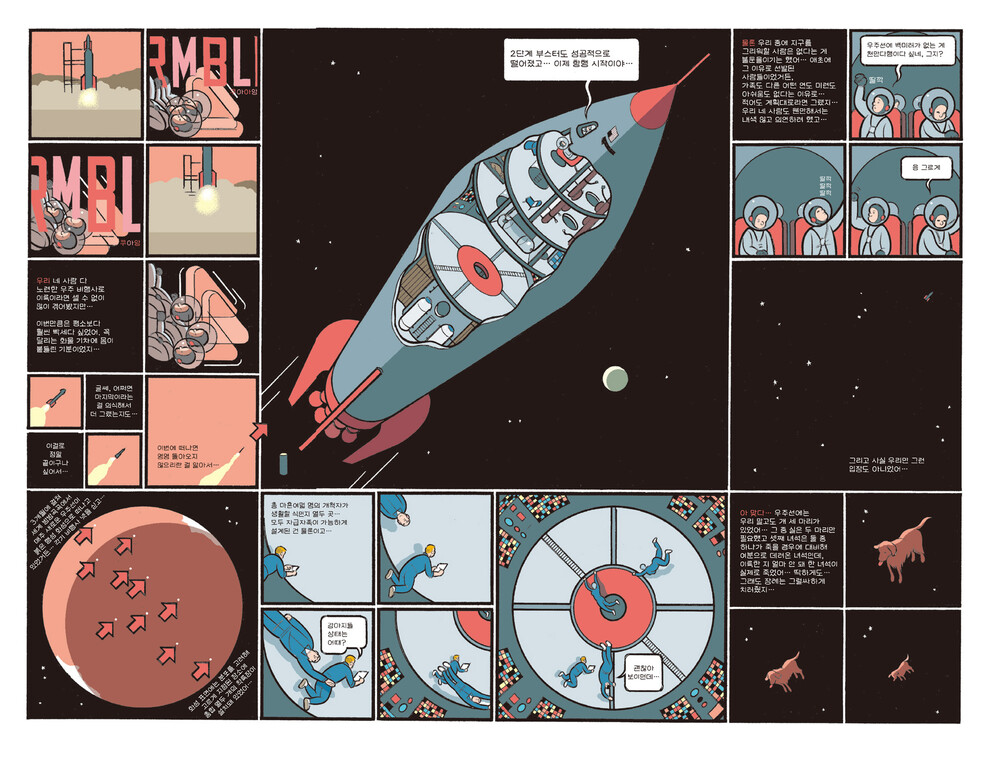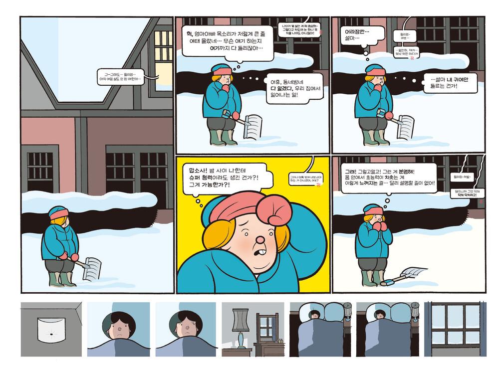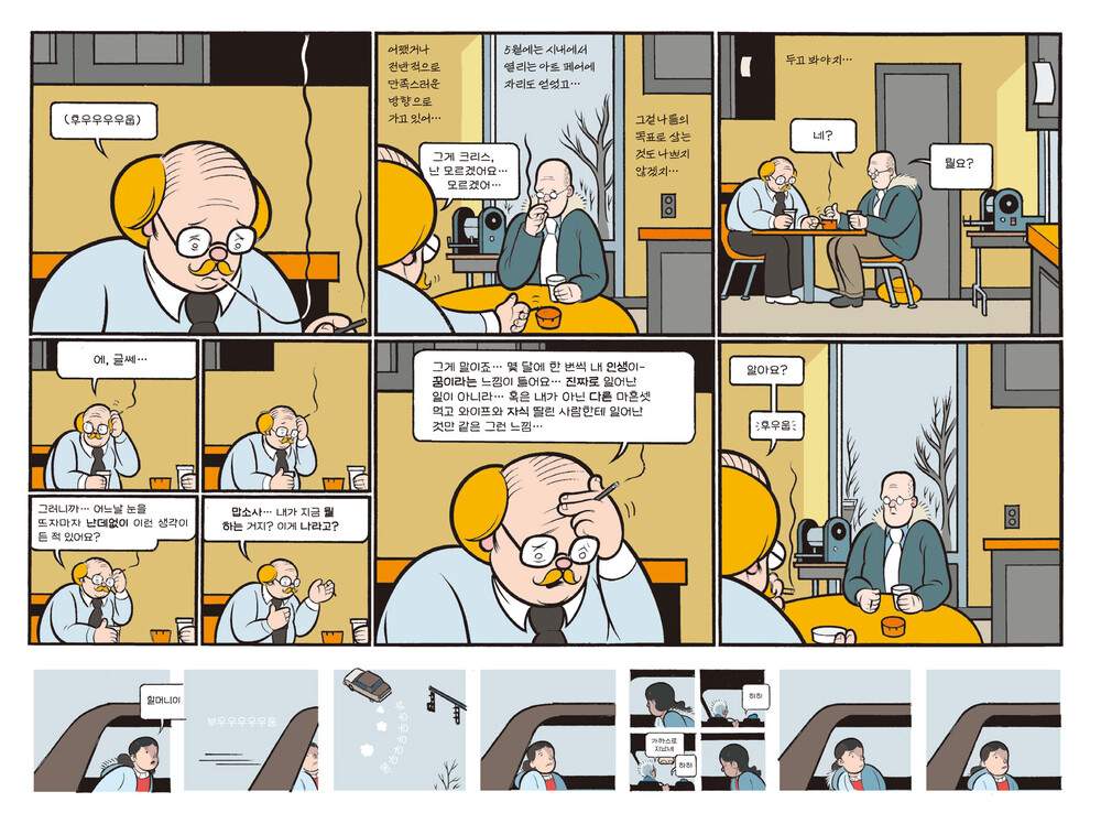 1970년대 미국 중서부 네브래스카의 눈 쌓인 저녁, 이 이야기는 시작됩니다. 하나의 눈 결정은 아름답고 완결적이며 날렵한 테두리를 둘렀지만, 이들이 이루는 눈보라는 비정형의 꼴로 속도를 내며 거기 속한 이들을 휩쓸고 묻습니다. 아주 작은 것부터 아주 큰 것까지, 다양한 크기의 칸을 통해 크리스 웨어는 여기 사는 사람들의 이야기를 한꺼번에 전달합니다. 무력한 인물들이나마, 지나쳐온 고유한 환경과 기억이 있고, 그 기억이 현재를 덮칠 때 이들의 미세하고 날카로운 감각이 되살아납니다. 이 책 속의 세부는 단순히 전체에 봉사하지 않으며, 그 자체로 의미를 발합니다.