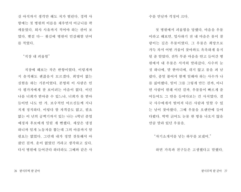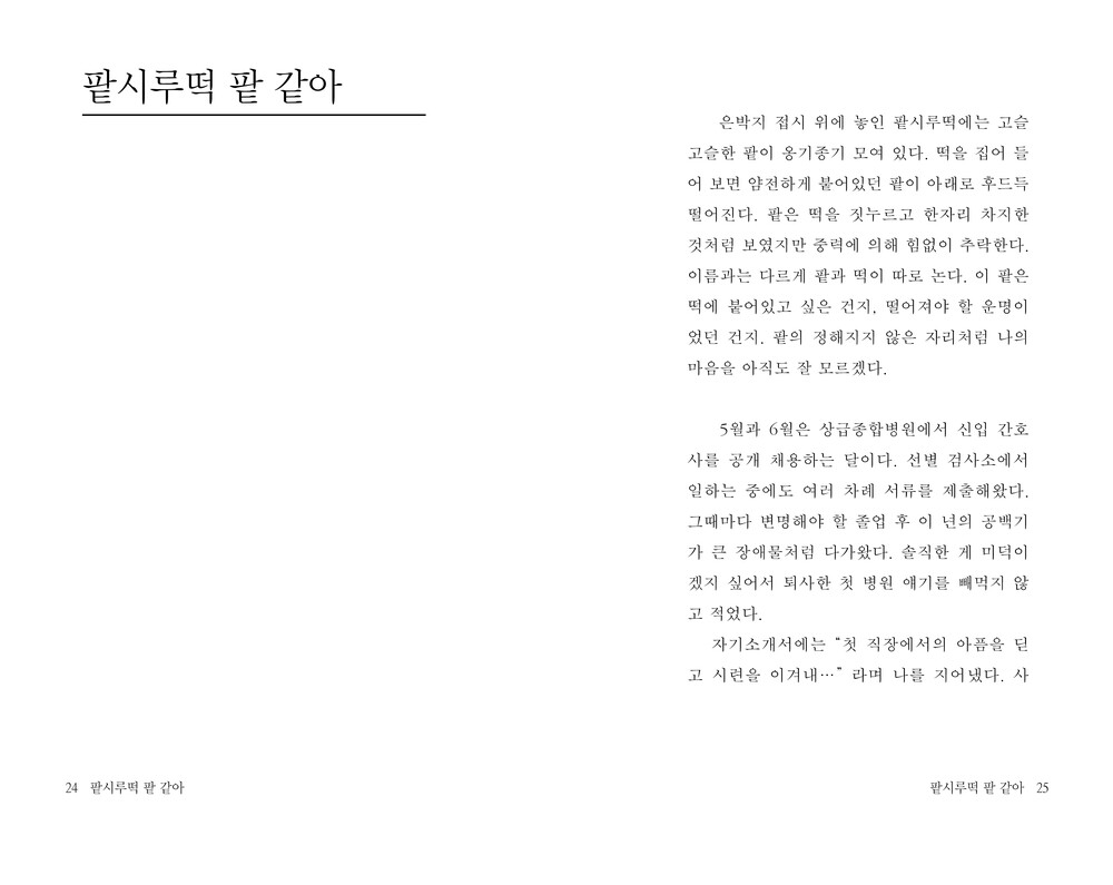 이 책은 팥시루떡 팥 같은 요즘을 살아가는 유휴 간호사의 삶과 고민이 담긴 책입니다.