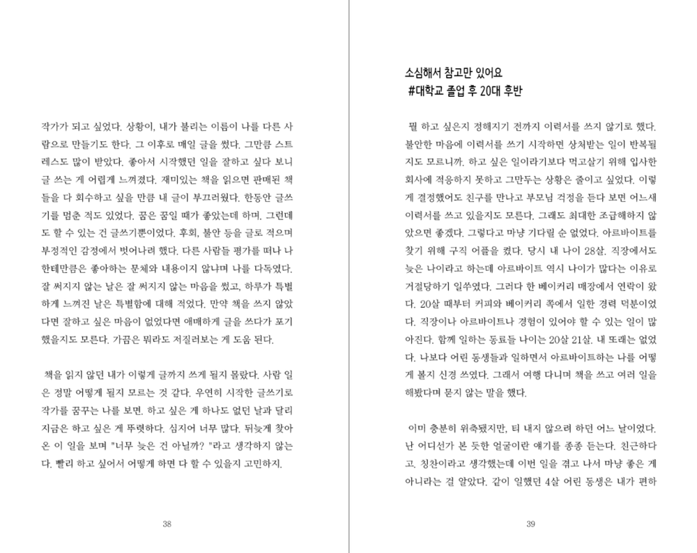 적다 보니 보이지 않던 무언가가 조금씩 모습을 보였어요. 제 문제라고 생각했는데 사회와 직장 내 문제도 있었어요.