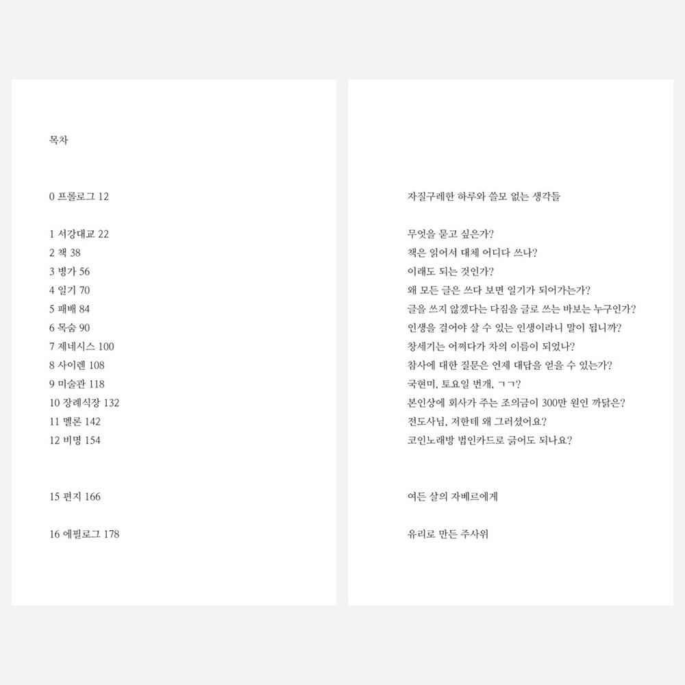 던지면 어떤 눈금이 나올지 모르는, 어딘가 부딪혀 깨질 것만 같은, 그래도 그 순간만큼은 각각의 빛을 내는 유리로 만든 주사위 같은 생각들을 한 권의 에세이로 묶었습니다.