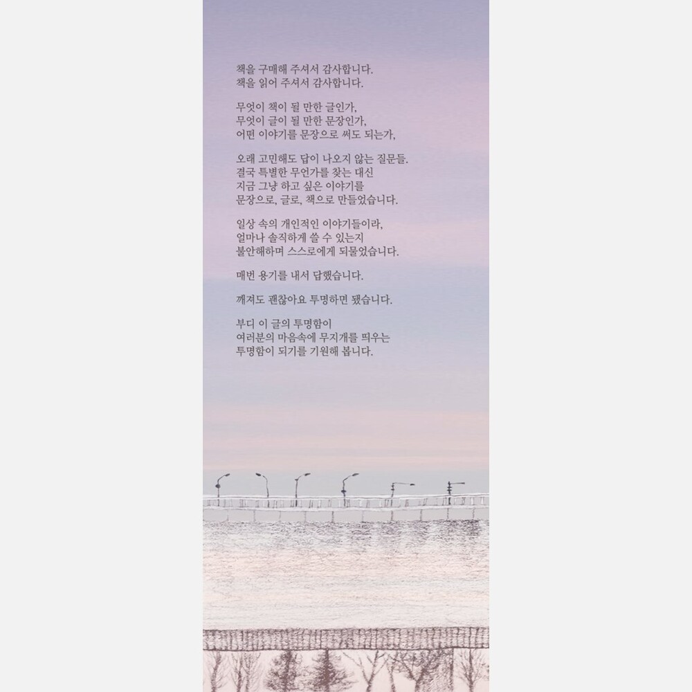 매일의 모습과 마음이 달라도 솔직하고 투명하게 쓰고자 했습니다.