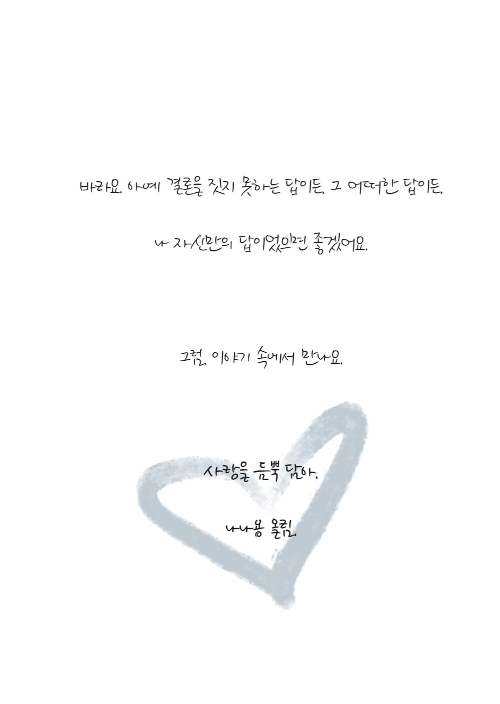 하루에 한 번 까맣게 어둠이 내려앉을 때면, 사방에서 우리를 지키고 있는 비닐이 모든 박자를 무너뜨리며 펄럭거렸고 그때 나는 늘 상상의 나래를 펼쳤다. 내 사람이 나에게 지어줄 이름이 뭘 지에 대해서 말이다.