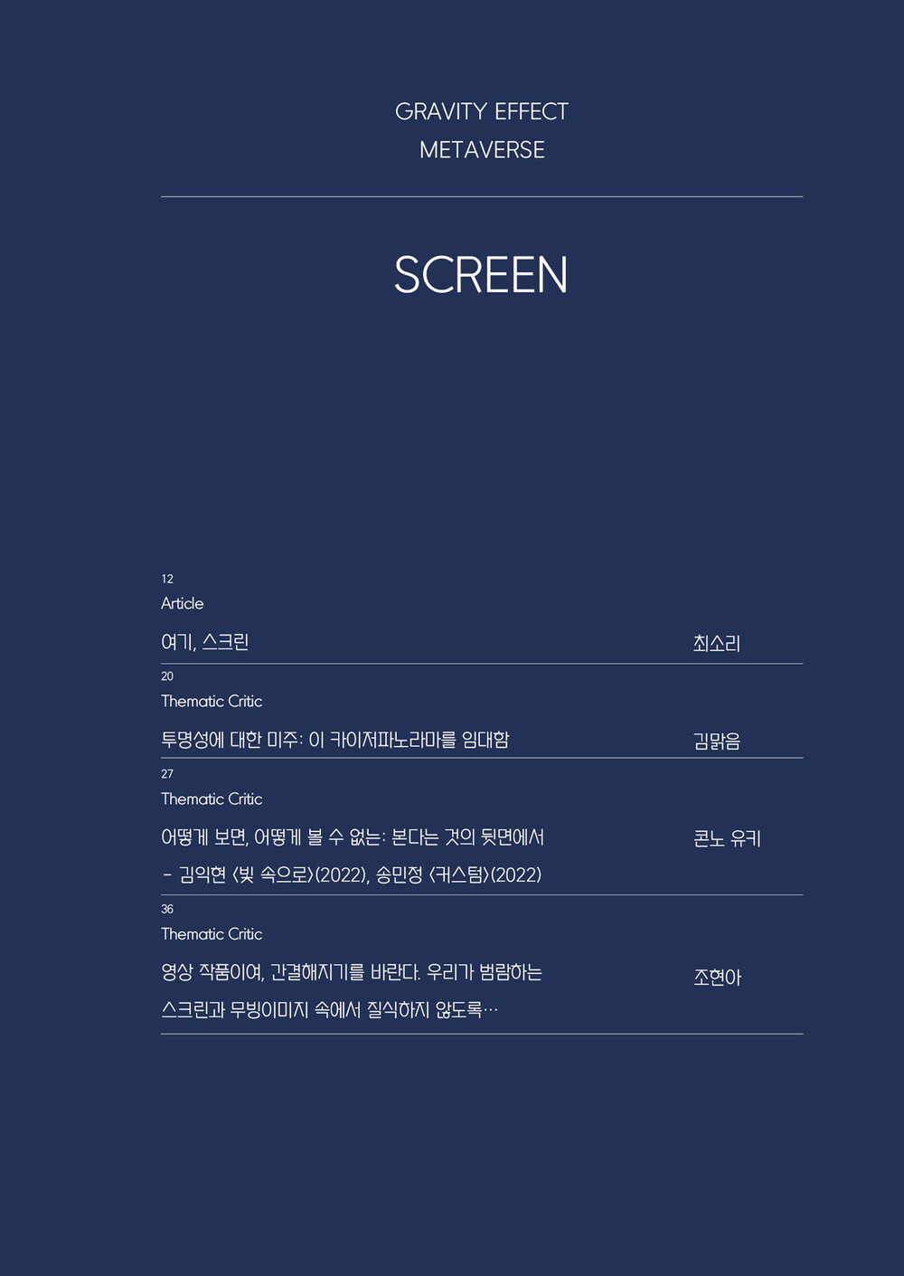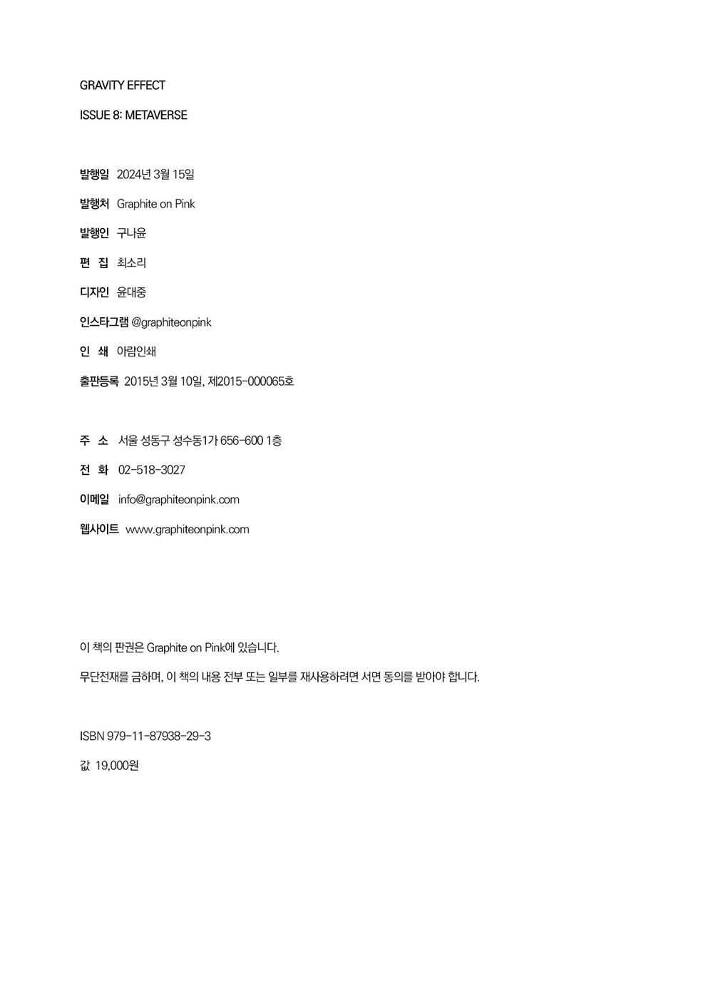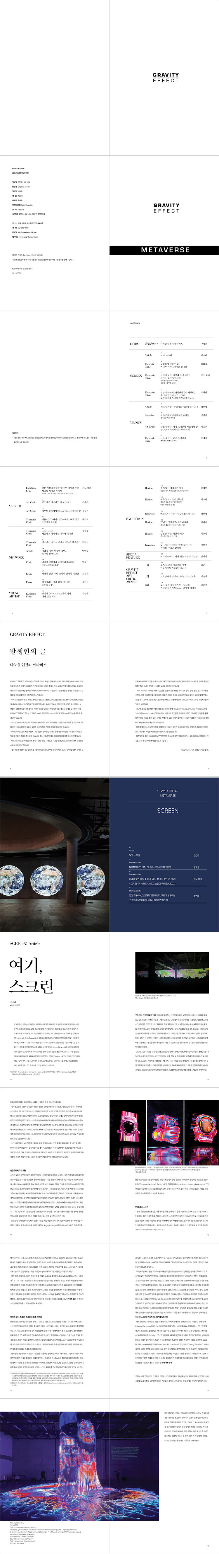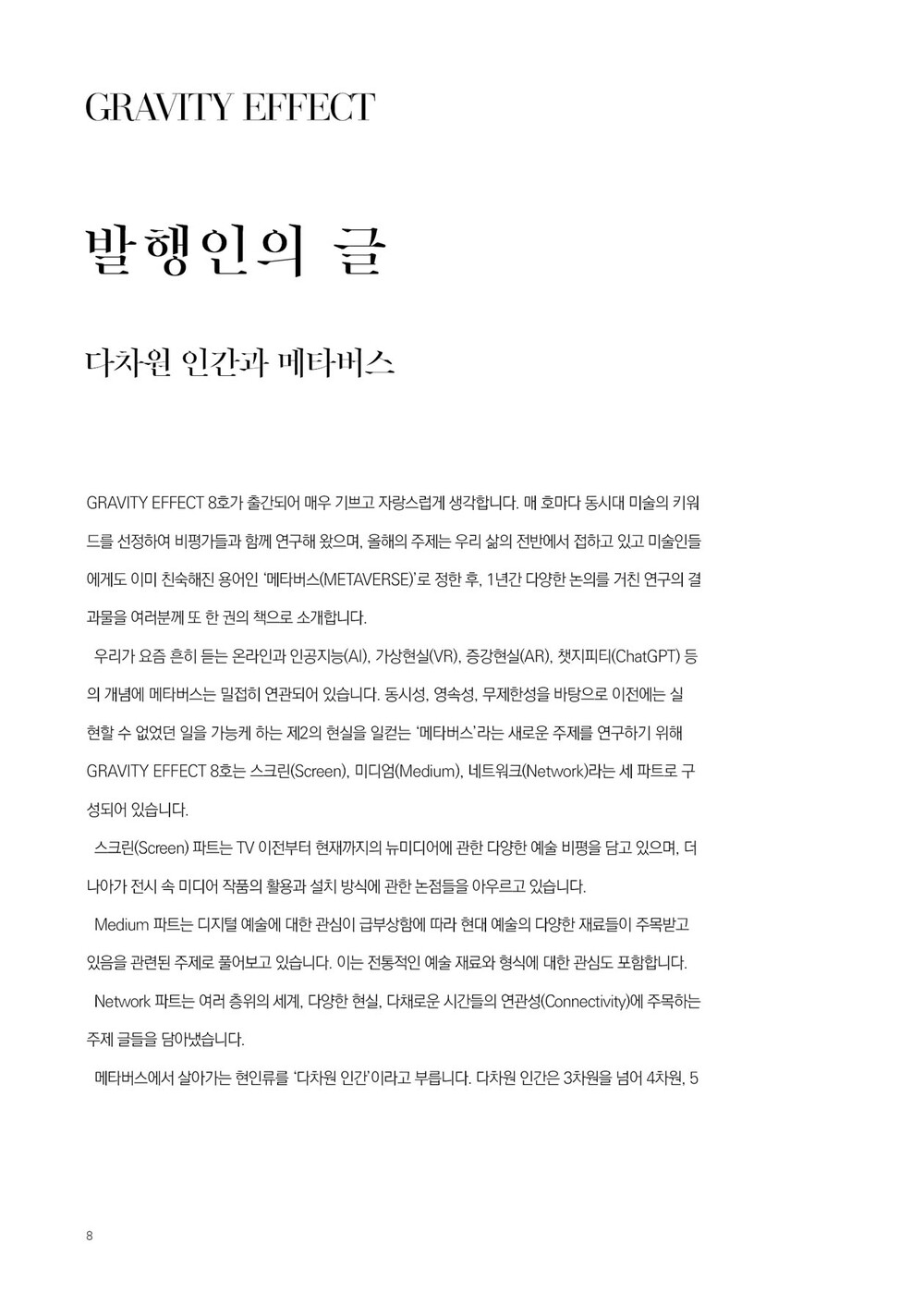 동시대 미술의 현장을 반영한 키워드에 따라 엮어온 비평지 그래비티 이펙트의 이번 8호의 키워드는 ‘메타버스(METAVERSE)’이다. 요즘 일상생활을 하며 흔히 듣게 되는 용어들인 인공지능(AI), 가상현실(VR), 증강현실(AR), 챗지피티(ChatGPT) 등과 밀접히 연관되어 있는 개념이 바로 ‘메타버스’이다. ‘메타버스’는 동시성, 영속성, 무제한성을 바탕으로 이전에는 실현할 수 없었던 일을 가능케 하는 제2의 현실을 일컫는 용어이며, 이번 주제를 연구하기 위해 책의 구성은 스크린(Screen), 미디엄(Medium), 네트워크(Network)라는 세 파트로 구성이 된다.