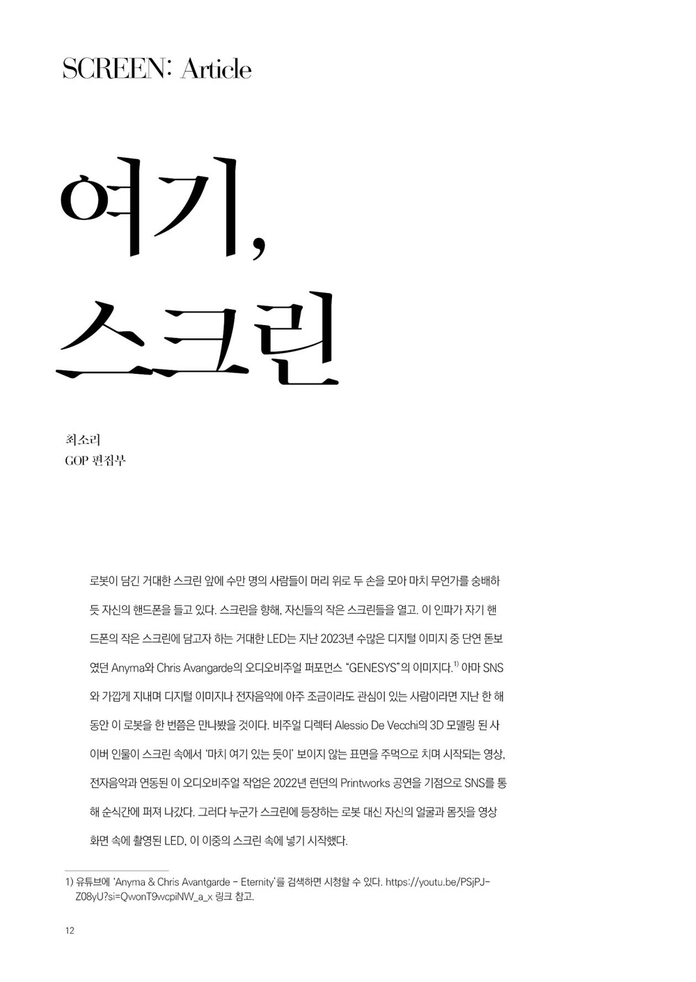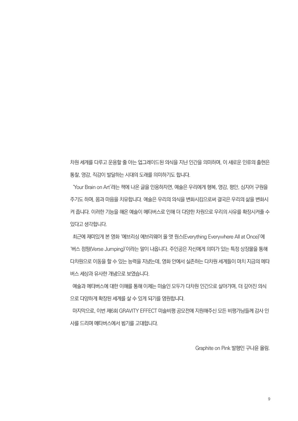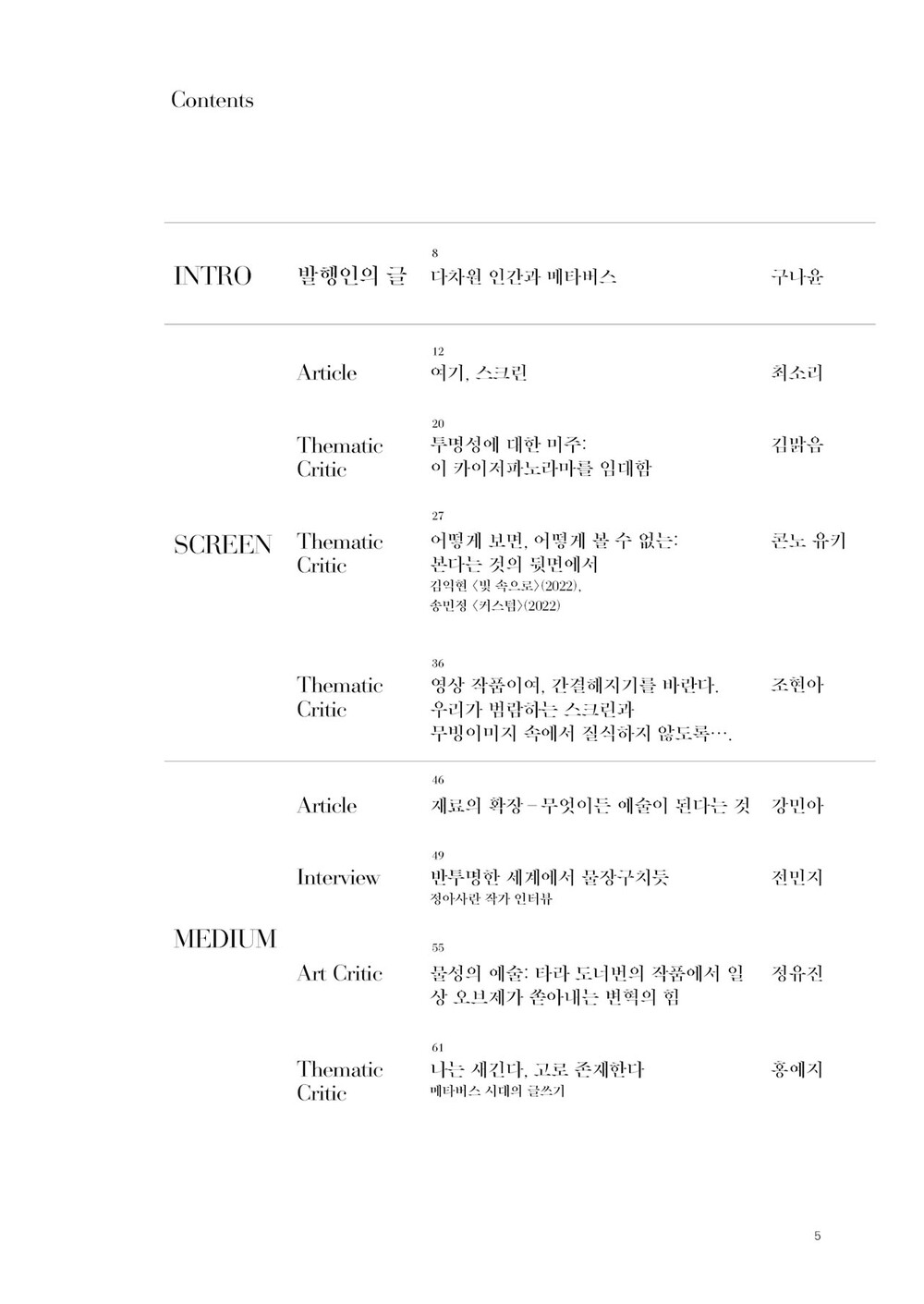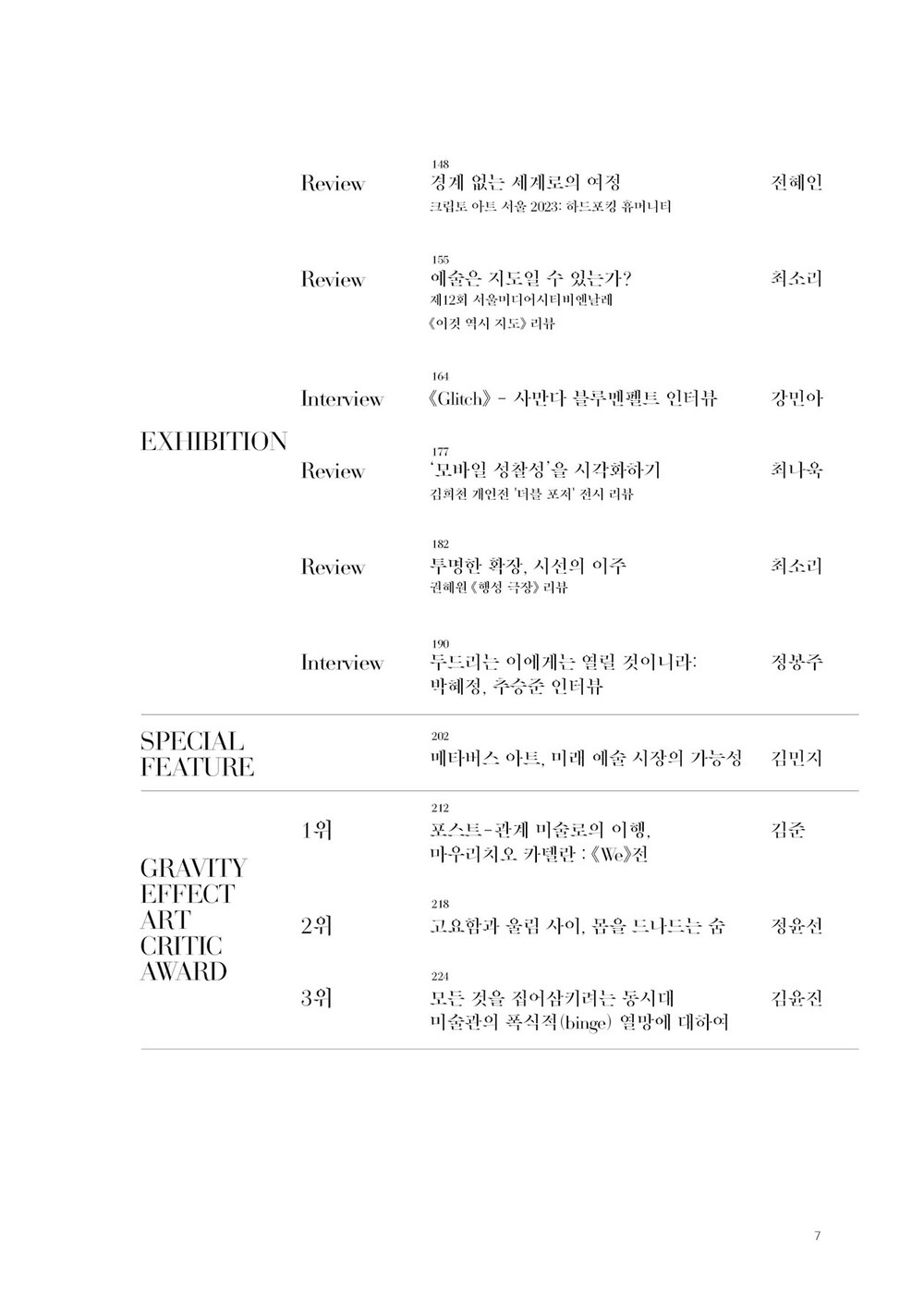 동시대 미술의 현장을 반영한 키워드에 따라 엮어온 비평지 그래비티 이펙트의 이번 8호의 키워드는 ‘메타버스(METAVERSE)’이다. 요즘 일상생활을 하며 흔히 듣게 되는 용어들인 인공지능(AI), 가상현실(VR), 증강현실(AR), 챗지피티(ChatGPT) 등과 밀접히 연관되어 있는 개념이 바로 ‘메타버스’이다. ‘메타버스’는 동시성, 영속성, 무제한성을 바탕으로 이전에는 실현할 수 없었던 일을 가능케 하는 제2의 현실을 일컫는 용어이며, 이번 주제를 연구하기 위해 책의 구성은 스크린(Screen), 미디엄(Medium), 네트워크(Network)라는 세 파트로 구성이 된다.