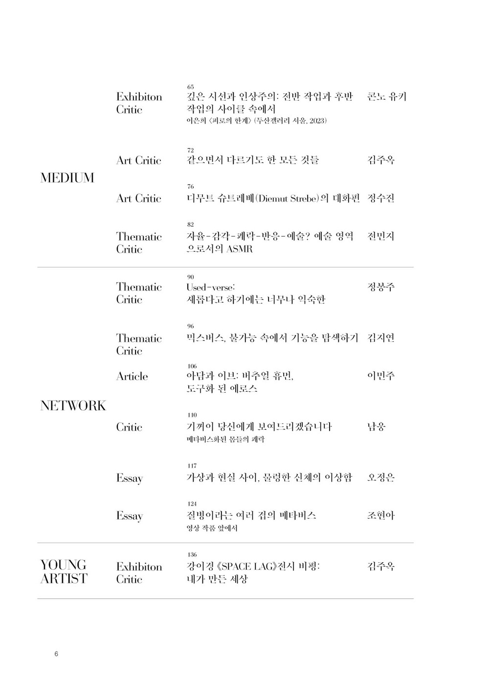 네트워크(Network) 파트는 여러 층위의 세계, 다양한 현실, 다채로운 시간들의 연관성(Connectivity)에 주목하는 주제 글들을 담아냈다.