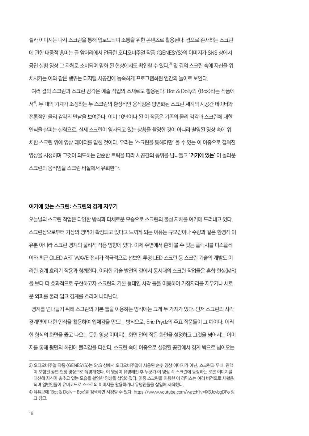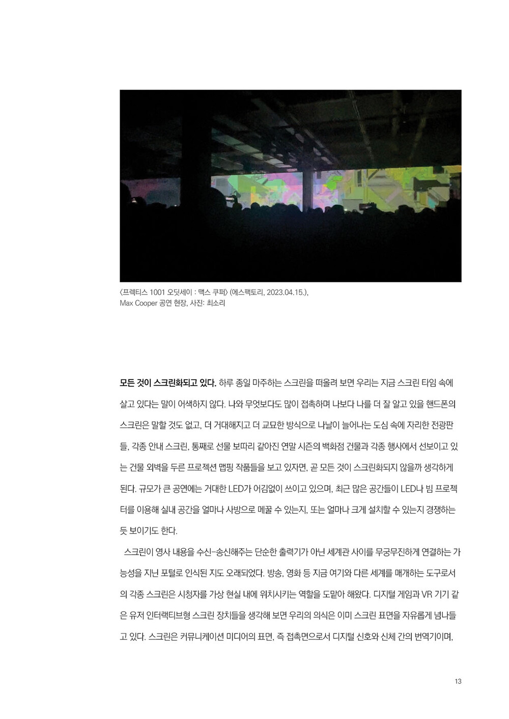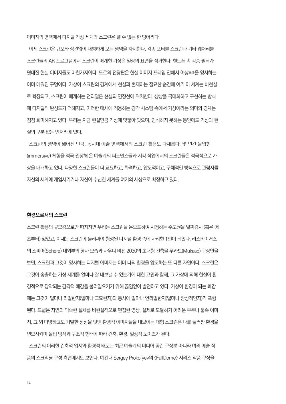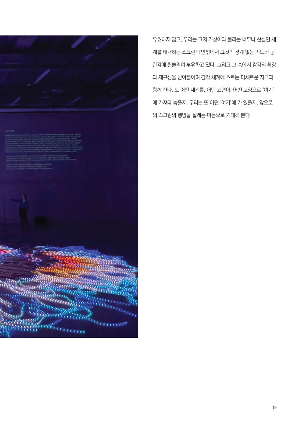 스크린(Screen) 파트는 TV 이전부터 현재까지의 뉴미디어에 관한 다양한 예술 비평을 담고 있으며, 더 나아가 전시 속 미디어 작품의 활용과 설치 방식에 관한 논점들을 아우르고 있다.