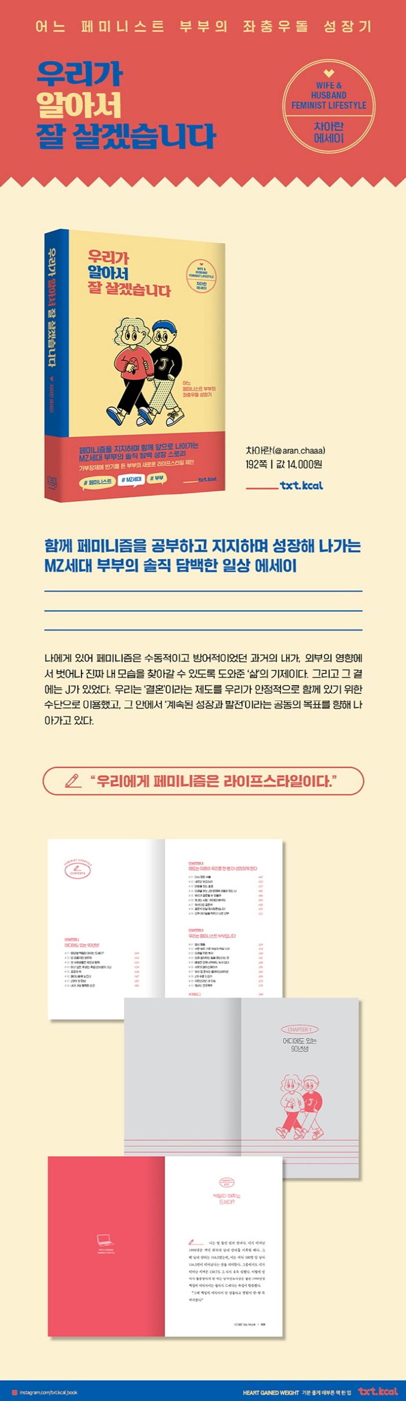 당신에게 페미니즘이란 무엇인가? 차아란 작가는 이 질문에 방어적이었던 과거의 내가, 외부의 영향에서 벗어나 진짜 내 모습을 찾아갈 수 있도록 도와준 ‘삶’의 기제라고 말한다. 그리고 모든 사람이 페미니즘을 ‘라이프스타일’로 받아들이고 일상 속에서 실천해 나갈 것을 강조한다. 『우리가 알아서 잘 살겠습니다』는 이 시대 부부들이 페미니즘을 통해 나다움을 잃지 않고, ‘계속된 성장과 발전’을 위해 함께 나아갈 수 있도록 다양한 인사이트를 제공할 것이다.