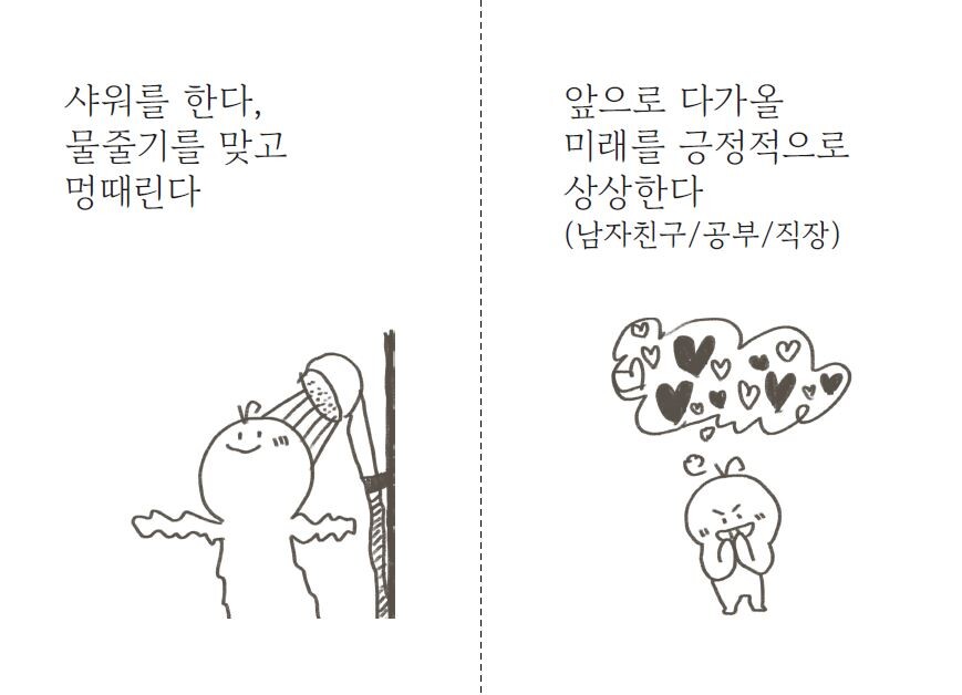 한 페이지에 한 문장이 쓰여 있고 밑에 제가 그린 어설퍼서 귀여운 일러스트가 있죠.