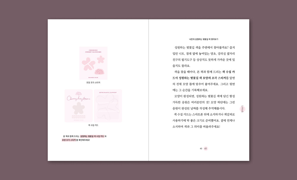 ‘성원하는 벚꽃길 색’은 함성 가득하고 시끌벅적한 응원을 담은 색입니다. “전폭적인 응원이 필요한 당신에게, 그런 벚꽃길을 닮은 이 색에, ‘성원; 소리를 질러 응원함’의 의미를 담아 선물합니다. 길을 걷다가 이 색을 마주치면, 나의 응원이 떠오르길 바라면서.”