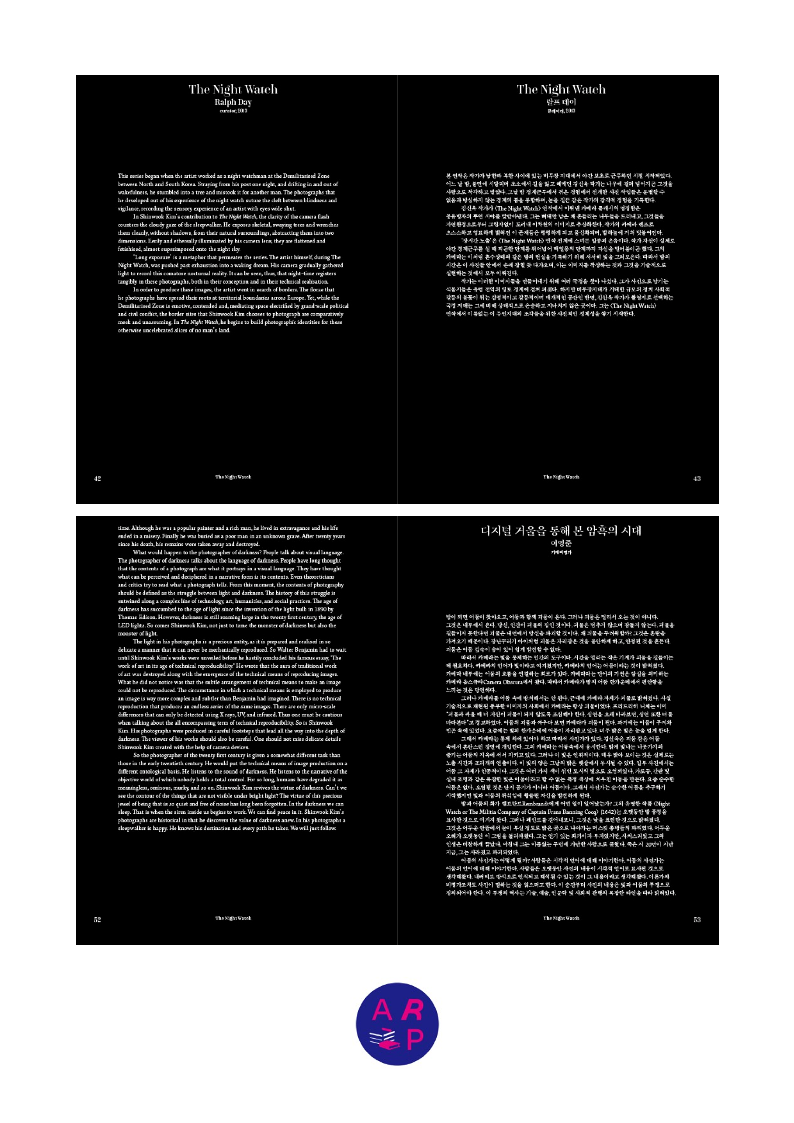 ‘The Night Watch’ 에는 동명의 연작 28점이 담겨 있으며 기계비평가 이영준의 글 'The Age of Darkness Seen through a Digital Mirror', 이탈리아 평론가 Viana Conti 의 'The Night Watch' 및 영국의 Ralph Day 의 평론글등이 함께 수록되어 있습니다.