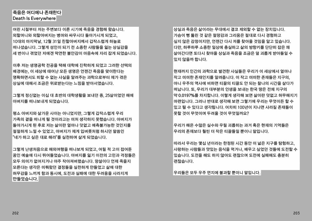 100가지 해골 드로잉을 통해 죽음의 존재를 상기시킴과 동시에 삶의 소중함을 느끼게 되기를 소망하며 제작한 책입니다.
