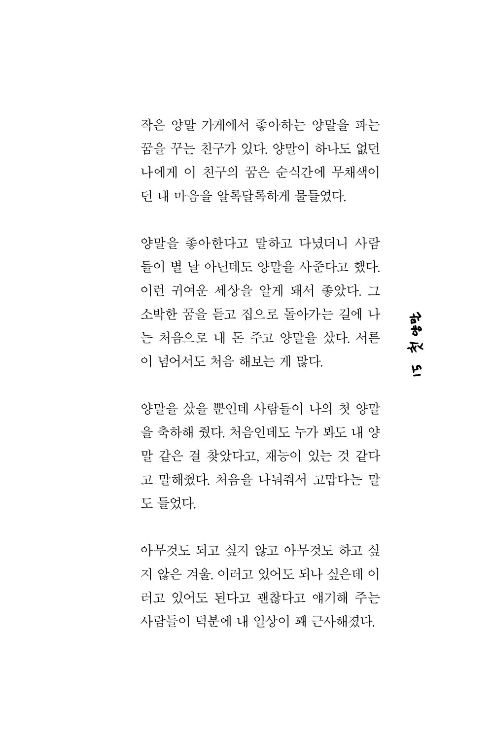 그 소박한 꿈을 듣고 집으로 돌아가는 길에 나는 처음으로 내 돈 주고 양말을 샀다.