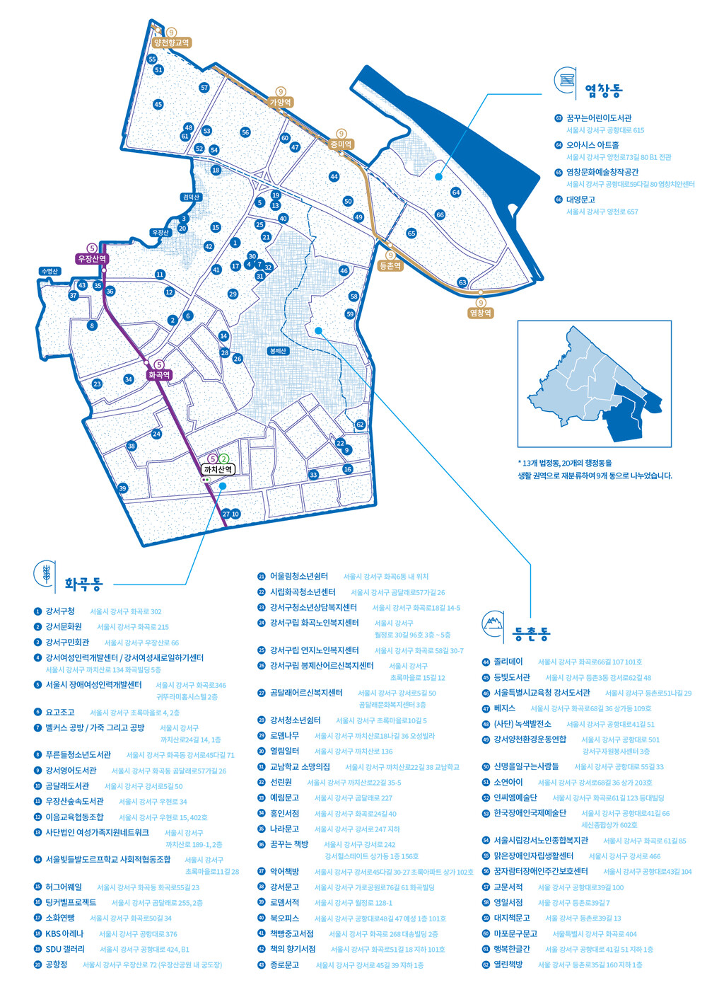 이 책자는 2022 강서 N개의 서울 사업단이 2021년부터 수집한 자료를 바탕으로 제작하였습니다. 강서구 내 기관, 센터, 문화공간, 도서관, 사회적 경제, 환경, 관광지, 복지시설, 장애인복지관, 서점 등 137곳을 카테고리 10개로 정리하였고 동 별로 다시 나누어 편하게 볼 수 있도록 하였습니다. 13개의 법정동, 20개의 행정동. 41.44㎢의 면적으로 이루어진 강서구는 60만에 가까운 인구가 살아가는 지자체입니다. 서울지역 25개 행정구 중 주거인구가 두 번째로 많은 만큼 다양한 문화예술인이 살아가는 강서구. 이 책자는 모든 강서구 단체를 기록하지는 못했지만, 그 부족함이 여백으로 남아 강서구 내 문화예술 공간들이 더 자세하게 기록될 수 있는 원동력이자 실마리가 될 것입니다. 2022 강서문화 예술지도는 강서 N개의 서울 인스타그램과 네이버 카페, 강서아카이브, 다시서점, 서울문화재단 로컬투서울 사이트 등에서도 확인하실 수 있습니다.