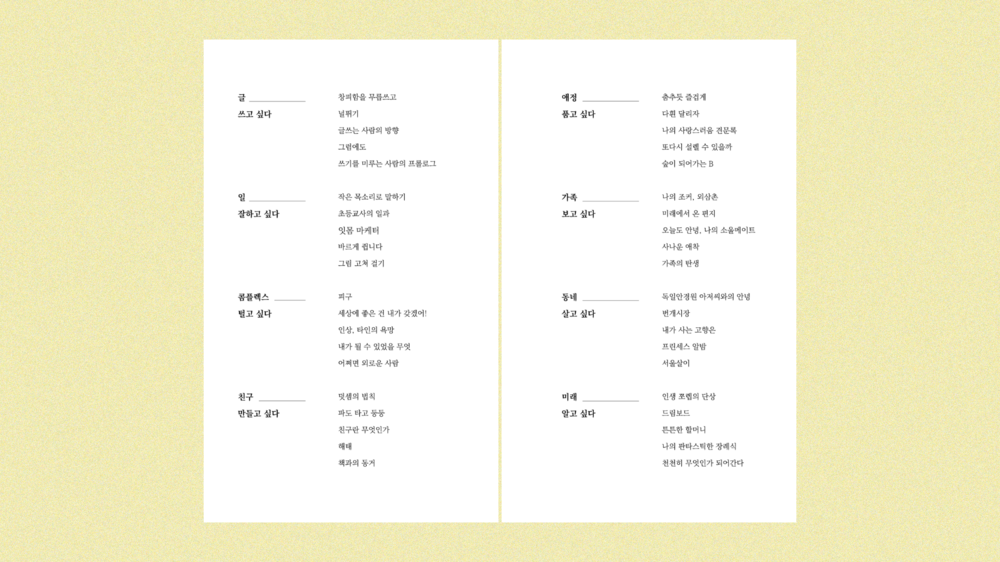 쓰기·일·콤플렉스·친구·좋아하는 것·가족·동네·미래의 여덟 가지 주제로, 우리처럼 하고 싶은 게 많지만