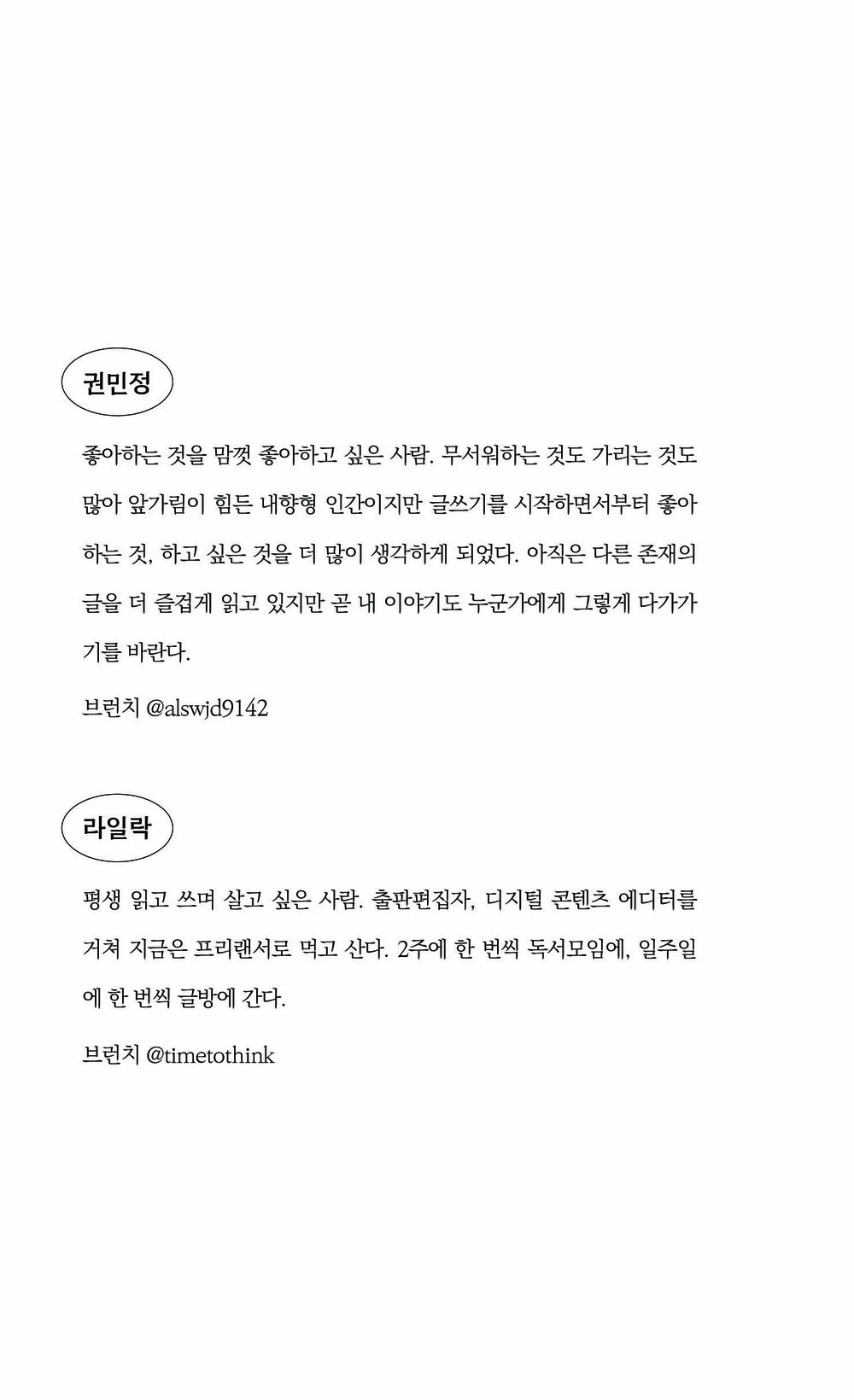 좋아하는 것을 맘껏 좋아하고 싶은 사람. 무서워 하는 것도 가리는 것도 많아 앞가림이 힘든 내향형 인간이지만 글쓰기를 시작하면서부터 좋아하는 것, 하고 싶은 것을 더 많이 생각하게 되었다. 아직은 다른 존재의 글을 더 즐겁게 읽고 있지만 곧 내 이야기도 누군가에게 그렇게 다가가기를 바란다.