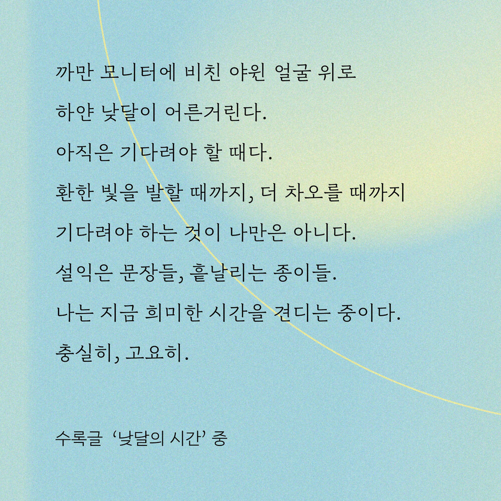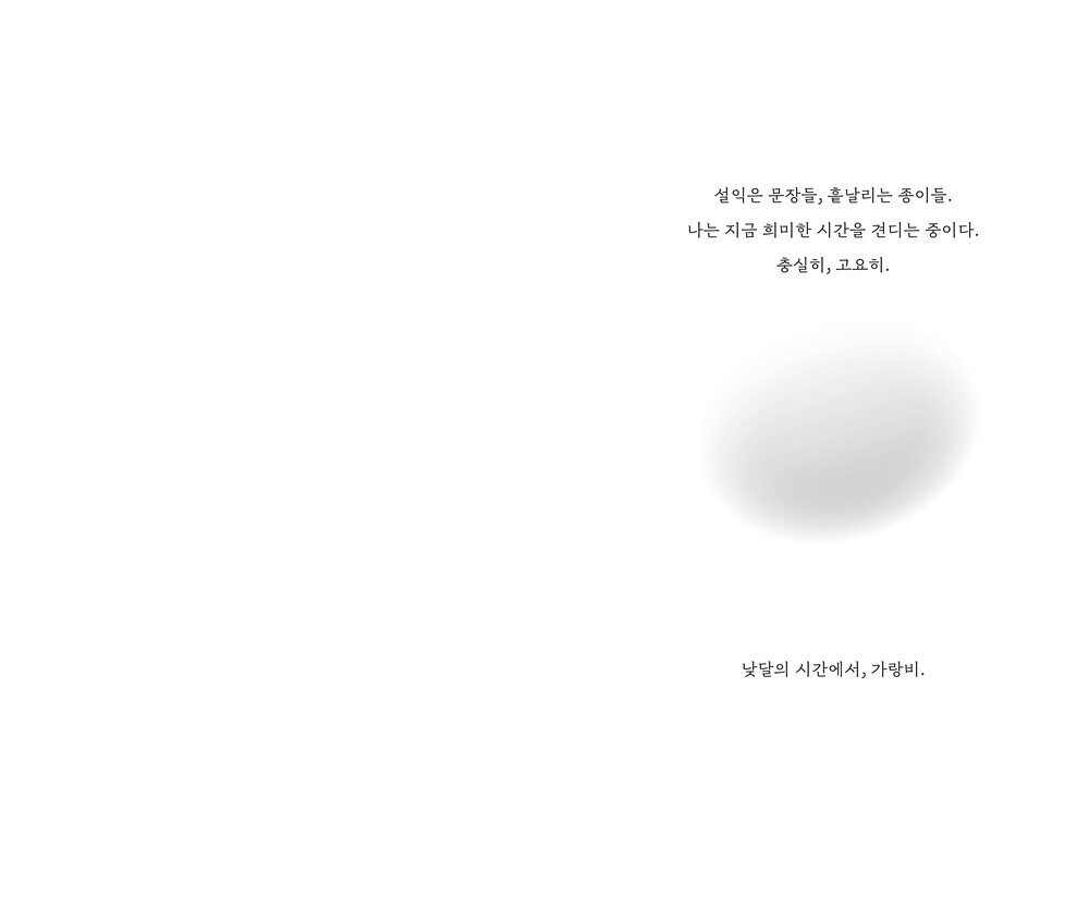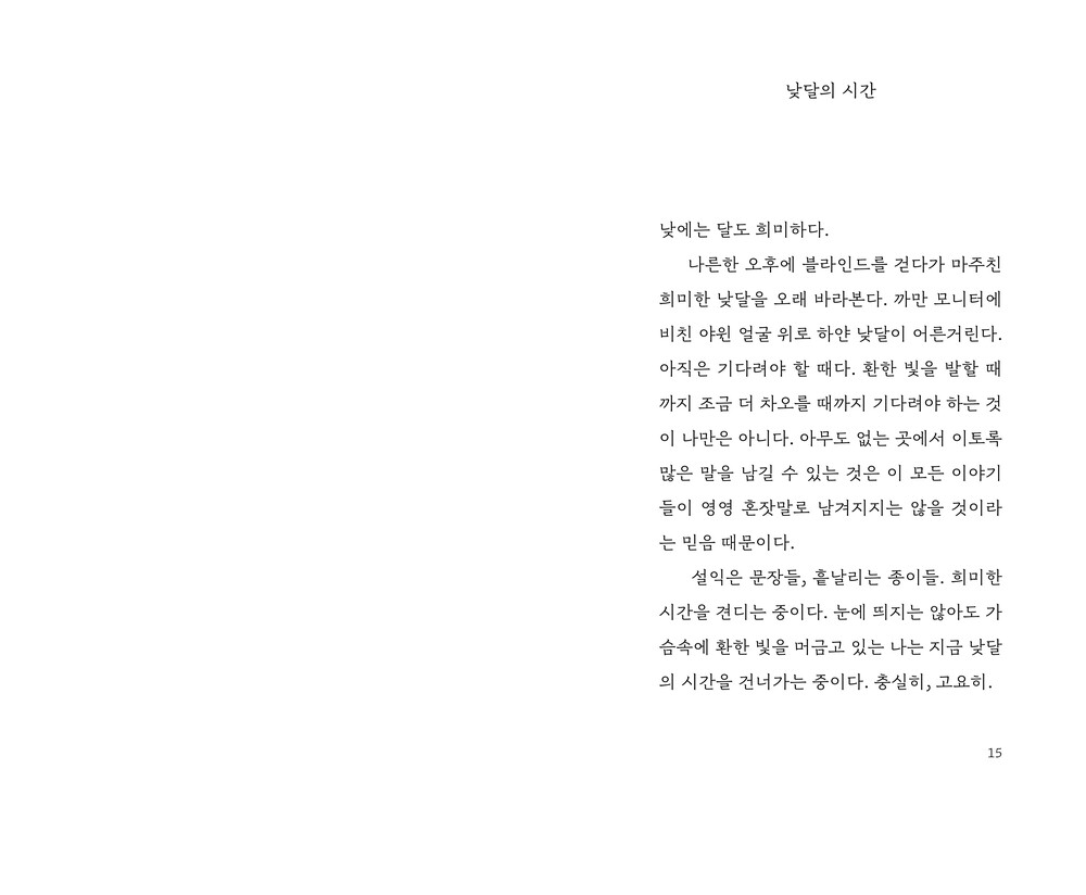 ‘까만 모니터에 비친 야윈 얼굴 위로 하얀 낮달이 어른거린다. 아직은 기다려야 할 때다. 환한 빛을 발할 때까지, 조금 더 차오를 때까지 기다려야 하는 것이 나만은 아니다. 설익은 문장들, 흩날리는 종이들. 나는 지금 희미한 시간을 견디는 중이다. 충실히, 고요히.’