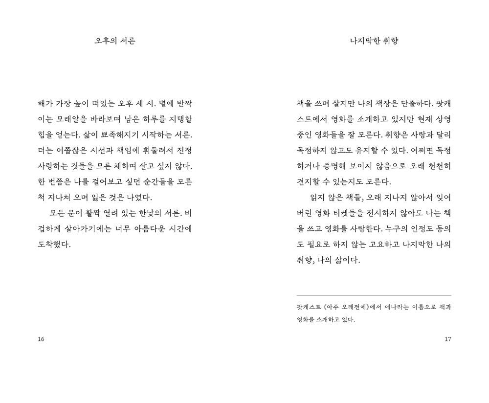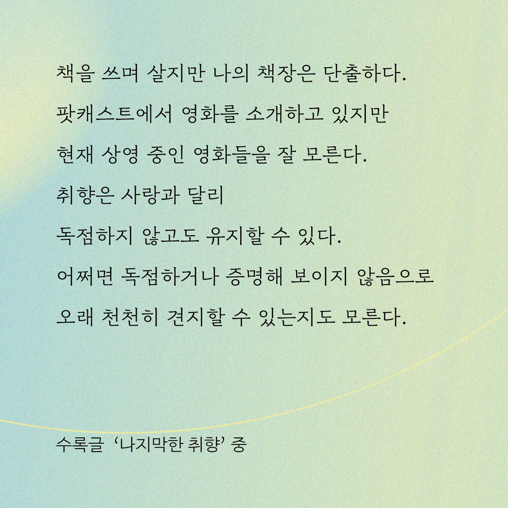 책을 쓰며 살지만 나의 책장은 단출하다. 팟캐스트에서 영화를 소개하고 있지만 현재 상영 중인 영화들을 잘 모른다. 취향은 사랑과 달리독점하지 않고도 유지할 수 있다. 어쩌면 독점하거나 증명해 보이지 않음으로 오래 천천히 견지할 수 있는지도 모른다.