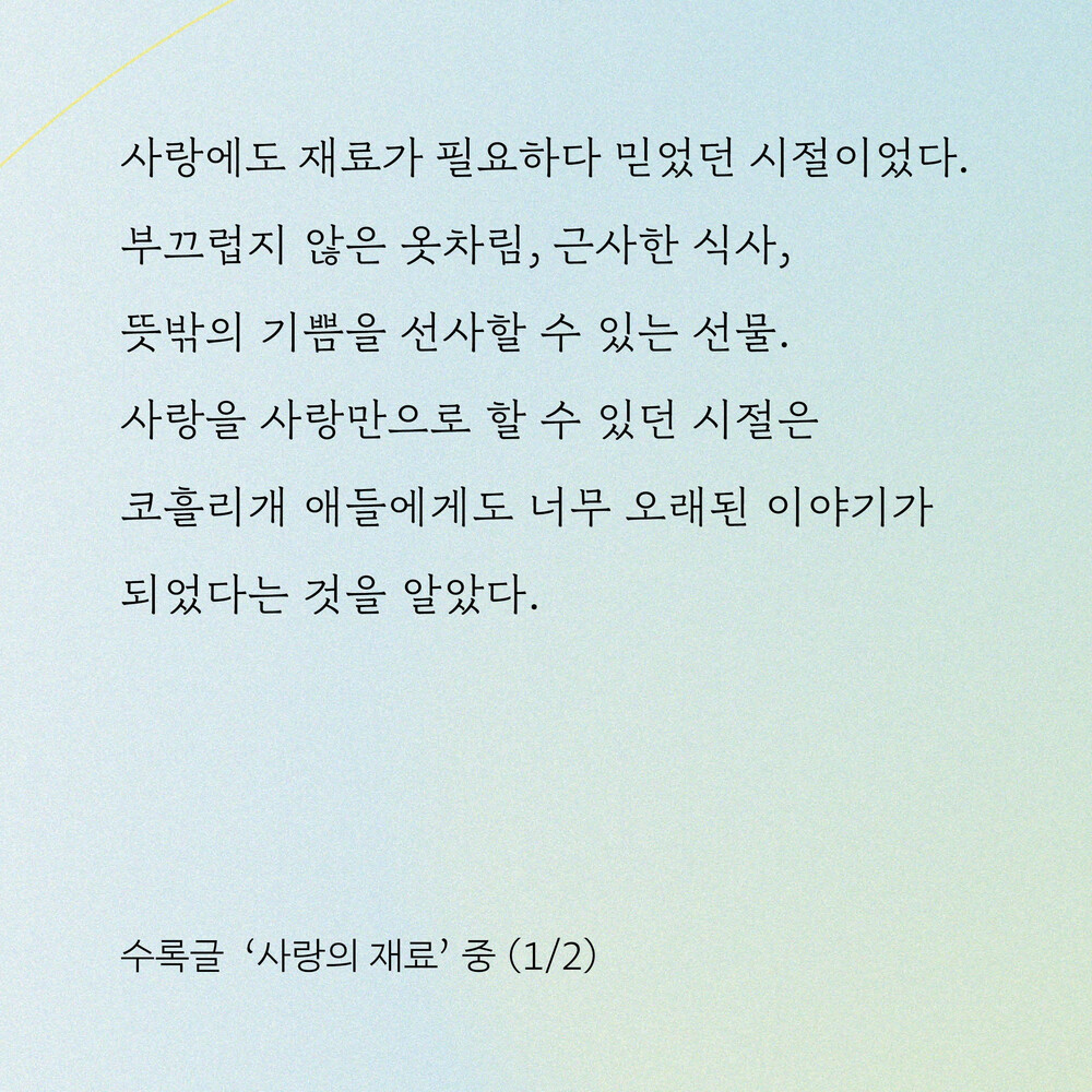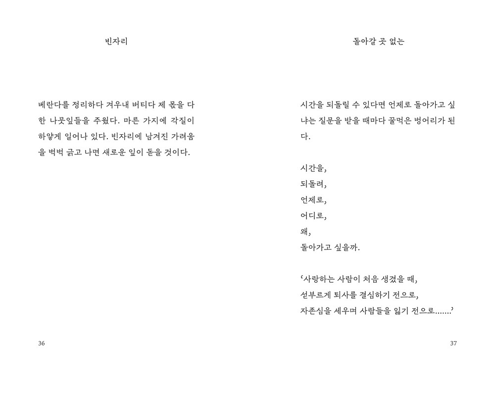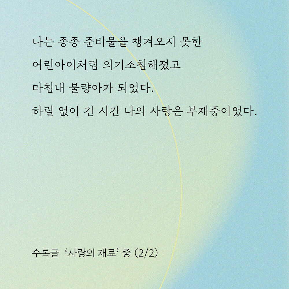 ‘사랑에도 재료가 필요하다 믿었던 시절이었다. 부끄럽지 않은 옷차림, 근사한 식사, 뜻밖의 기쁨을 선사할 수 있는 선물. 사랑을 사랑만으로 할 수 있던 시절은 코흘리개 아이들에게도 너무 오래된 이야기가 되었다는 것을 알았다. 나는 종종 준비물을 챙겨오지 못한 어린아이처럼 의기소침해졌고 마침내 불량아가 되었다. 하릴 없이 긴 시간 나의 사랑은 부재중이었다.’