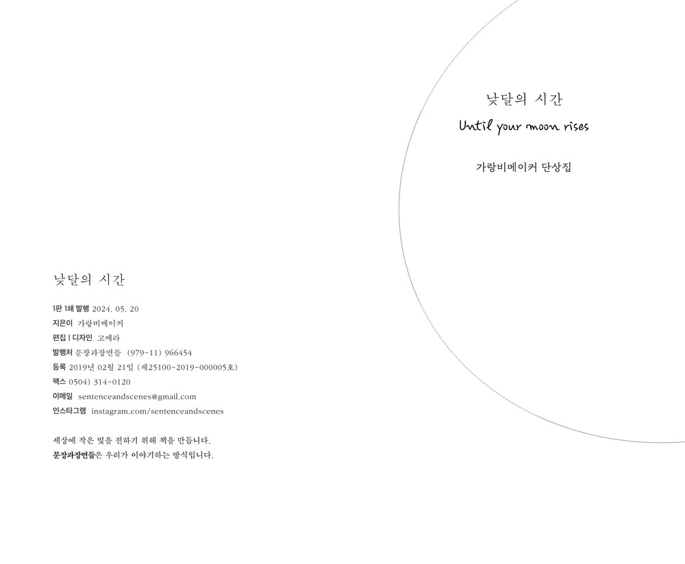 2015년 『지금, 여기를 놓친 채 그때, 거기를 말한들』 출간 직후, 베스트 스테디 셀러로 수만 명의 독자들에게 사랑을 받아온 작가 가랑비메이커의 새로운 이야기 『낮달의 시간』, 꾸준한 작업 활동과 변함 없는 문체로 많은 사랑을 받아온 가랑비만의 다정하고 고요한 응원의 세계로 초대합니다.