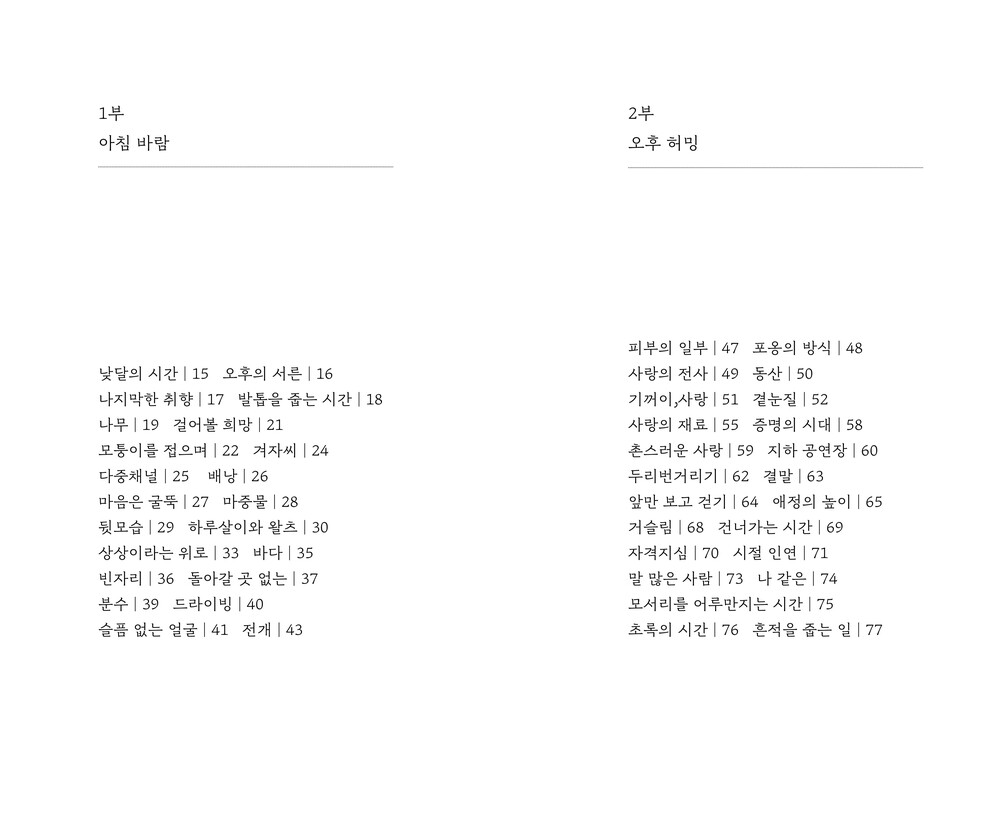 피부의 일부 | 47 포옹의 방식 | 48 사랑의 전사 | 49 동산 | 50기꺼이,사랑 | 51 곁눈질 | 52 사랑의 재료 | 55 증명의 시대 | 58 촌스러운 사랑 | 59 지하 공연장 | 60두리번거리기 | 62 결말 | 63 앞만 보고 걷기 | 64 애정의 높이 | 65 거슬림 | 68 건너가는 시간 | 69자격지심 | 70 시절 인연 | 71 말 많은 사람 | 73 나 같은 | 74 모서리를 어루만지는 시간 | 75 초록의 시간 | 76 흔적을 줍는 일 | 77