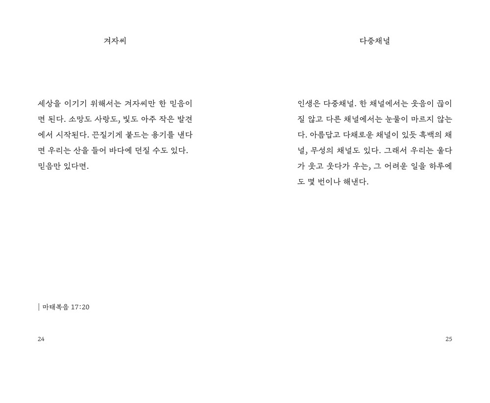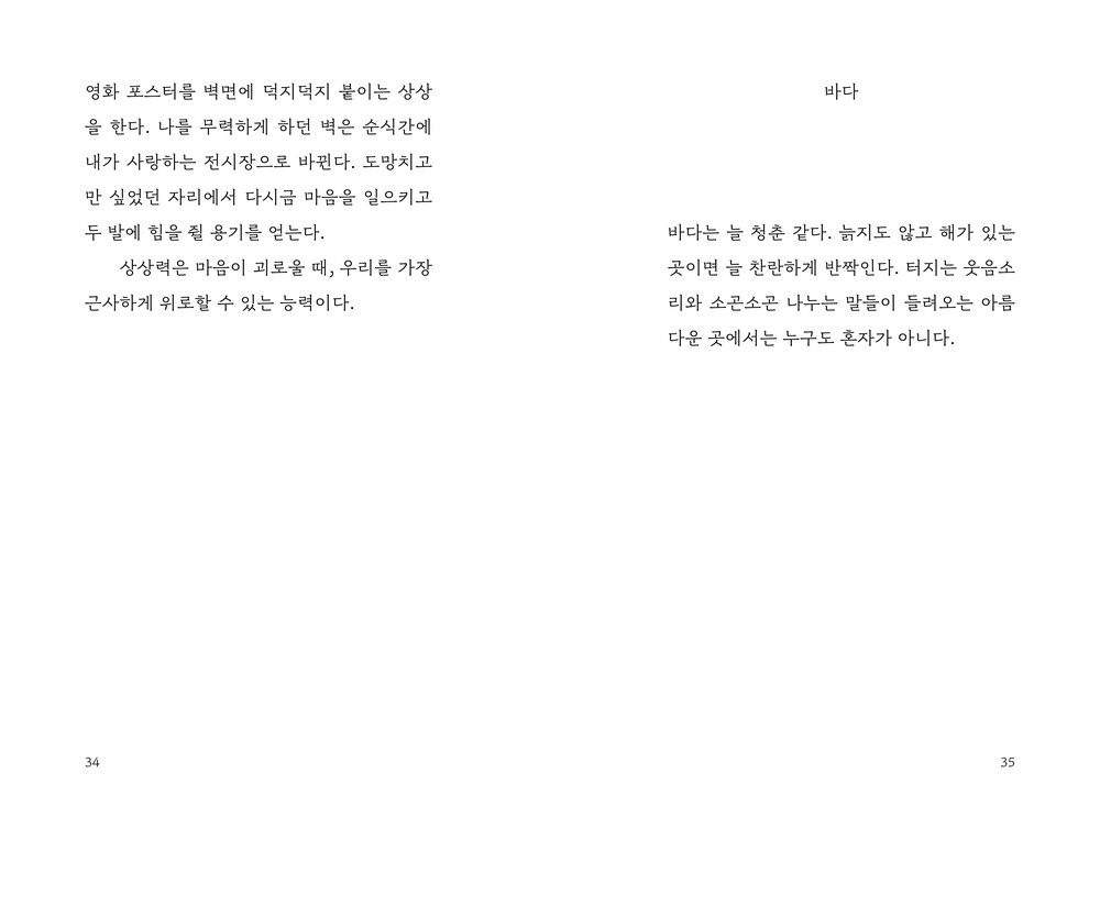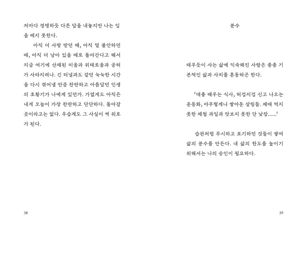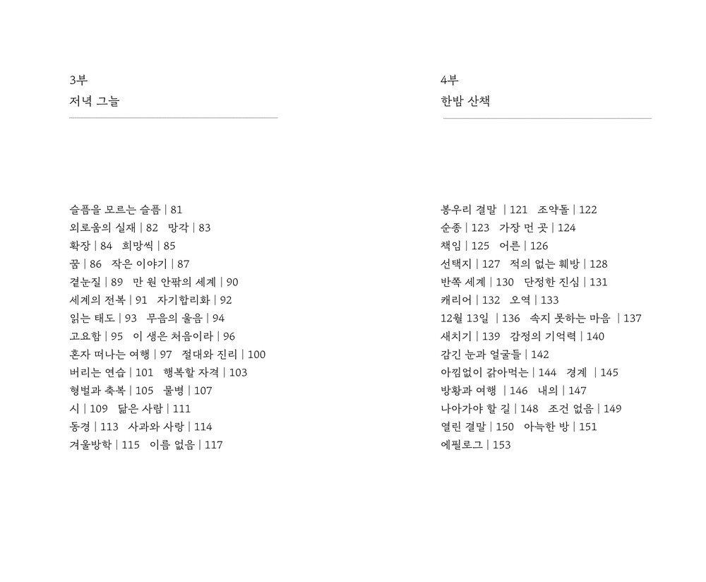 슬픔을 모르는 슬픔 | 81외로움의 실재 | 82 망각 | 83 확장 | 84 희망씩 | 85꿈 | 86 작은 이야기 | 87곁눈질 | 89 만 원 안팎의 세계 | 90 세계의 전복 | 91 자기합리화 | 92 읽는 태도 | 93 무음의 울음 | 94고요함 | 95 이 생은 처음이라 | 96 혼자 떠나는 여행 | 97 절대와 진리 | 100버리는 연습 | 101 행복할 자격 | 103형벌과 축복 | 105 물병 | 107 시 | 109 닮은 사람 | 111 동경 | 113 사과와 사랑 | 114 겨울방학 | 115 이름 없음 | 117