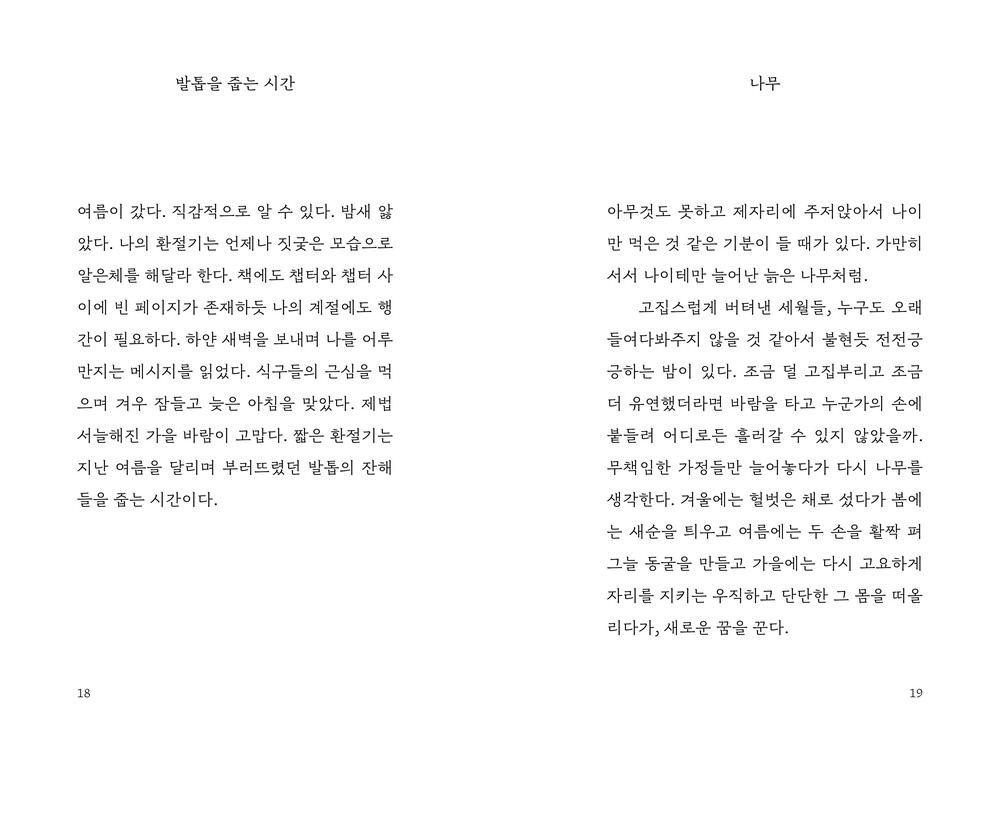 여름이 갔다. 직감적으로 알 수 있다. 밤새 앓았다. 나의 환절기는 언제나 짓궂은 모습으로알은체를 해달라 한다. 책에도 챕터와 챕터 사이에 빈 페이지가 존재하듯 나의 계절에도 행간이 필요하다.