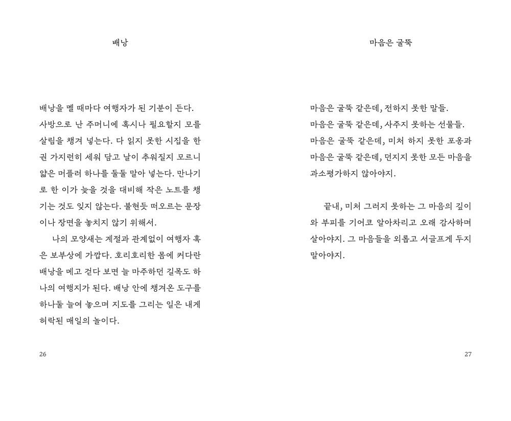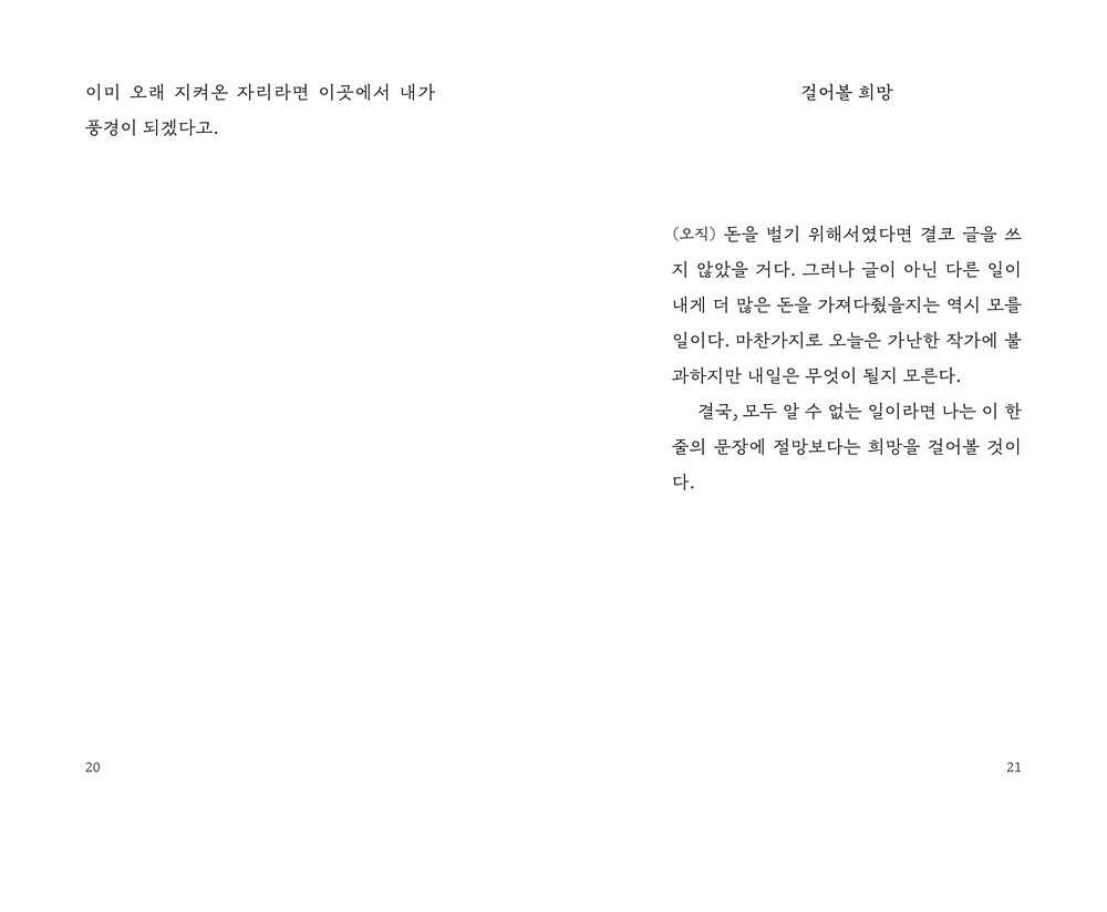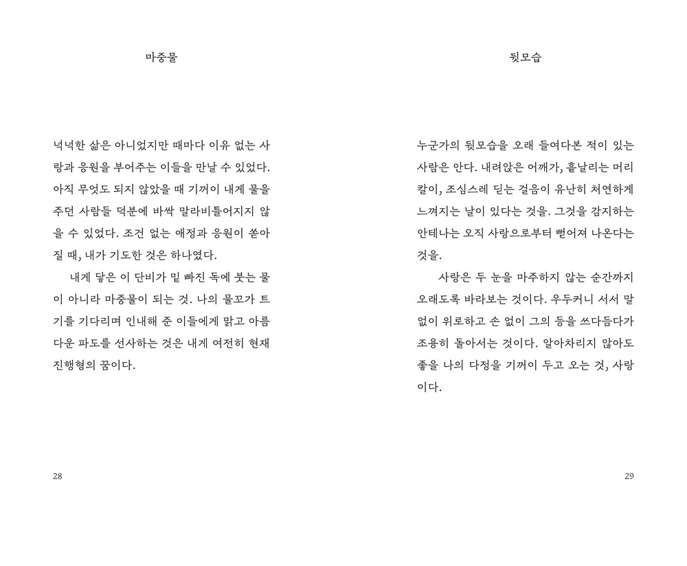 소리 없이 변화하는 계절의 변화를 목격하기 위해 매일 산책에 나선다. 하얀 낮에는 달도 희미하다는 사실을붙잡으며 매일 썼다. 마침내 어두워질 세상에 한 줄의 빛이 되길 기도하는 마음으로. 저서로는 『지금, 여기를 놓친 채 그때, 거기를 말한들』(2015), 『언젠가 머물렀고 어느 틈에 놓쳐버린』(2017), 『숱한 사람들 속을 헤집고 나왔어도』(2018), 『고요한 세계에 독백을 남길때』(2019), 『가깝고도 먼 이름에게』(2022), 『한 뼘의 계절에서 배운 것』(2022), 『오늘은 에세이를 쓰겠습니다』 (2023)를 썼다. 출판사 문장과장면들을 운영하며 가랑비클래스에서 다양한 글쓰기 수업을 진행한다.