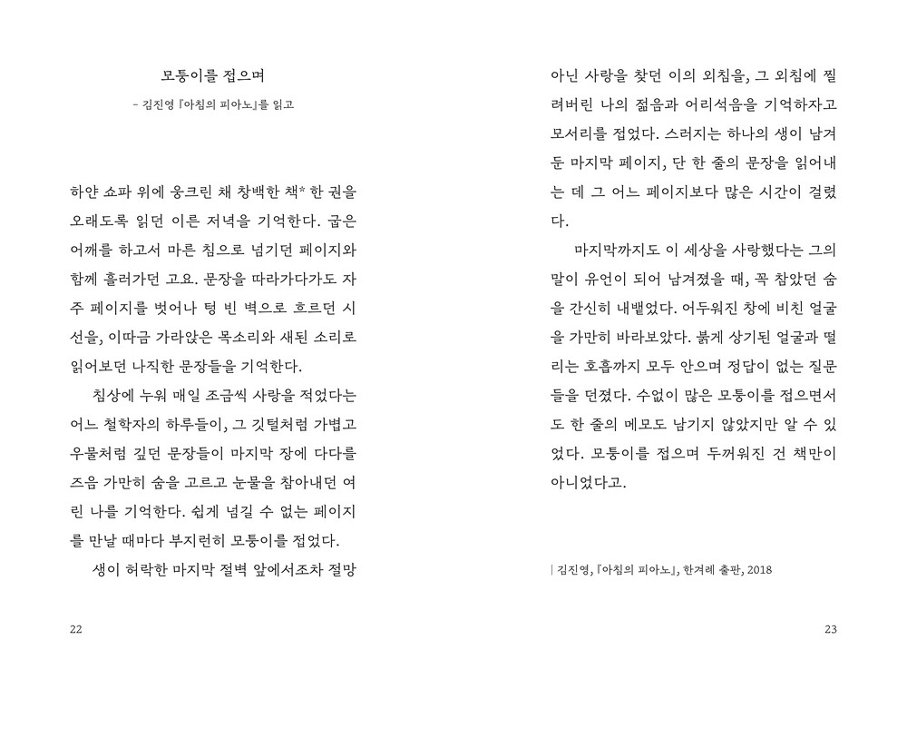 ‘집집마다 사연이 없다는 말을 되새길 때마다 긴 복도에 일렬로 서있는 같은 모양의 문들을 떠올린다. 낡은 문고리를 붙잡고 이른 아침밖을 나서는 사람들의 등을 상상하는 일에는 언제나 시큰해진 코끝이 함께한다.’