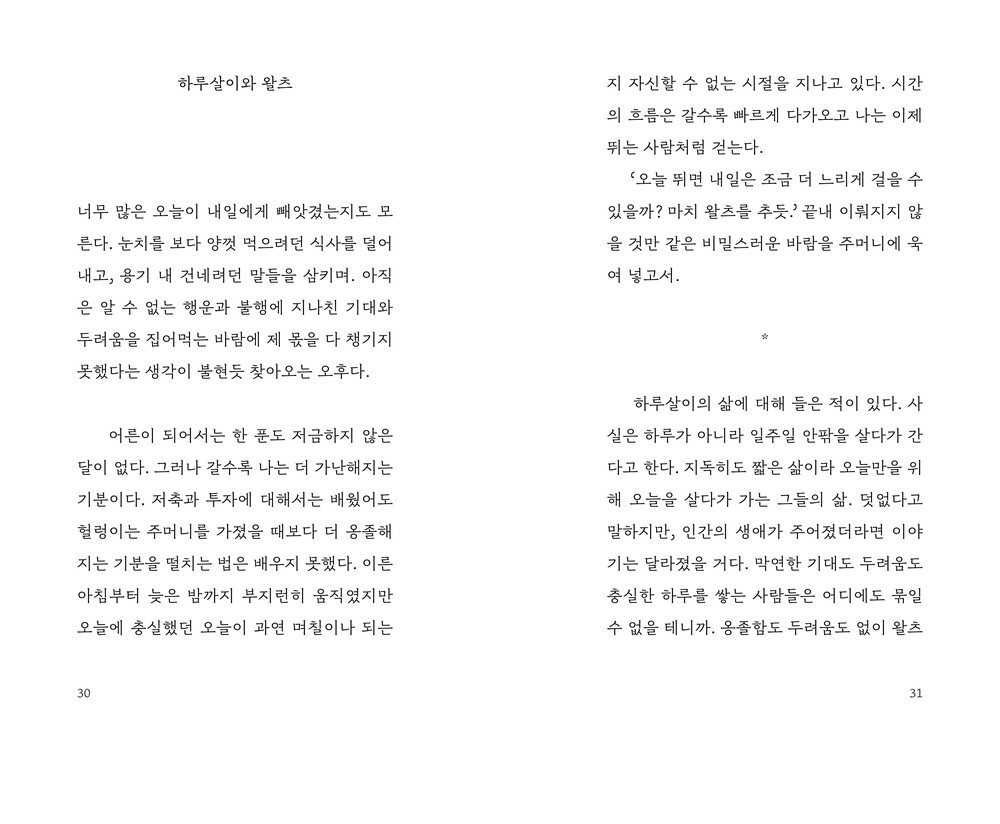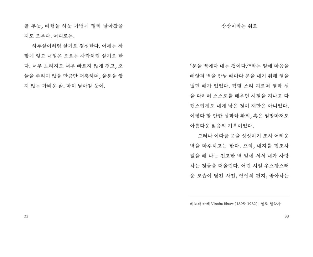 ‘아침 바람과 오후의 허밍, 저녁의 바람, 한밤의 산책. 그 어느것도 건너뛰지 않고 충실히 고요히 비밀스럽게 누리고 쓰고 쉬며 삶을 윤나게 가꾸어 나가고 싶다. 이미 이룬 삶만큼이나 무엇인가 되어가는 중에 있는 삶이 얼마나 찬란하고 아름다운지를 결코 잊지 않으며. 이 책은 현재진행형의 사람들을 위한 것이다’