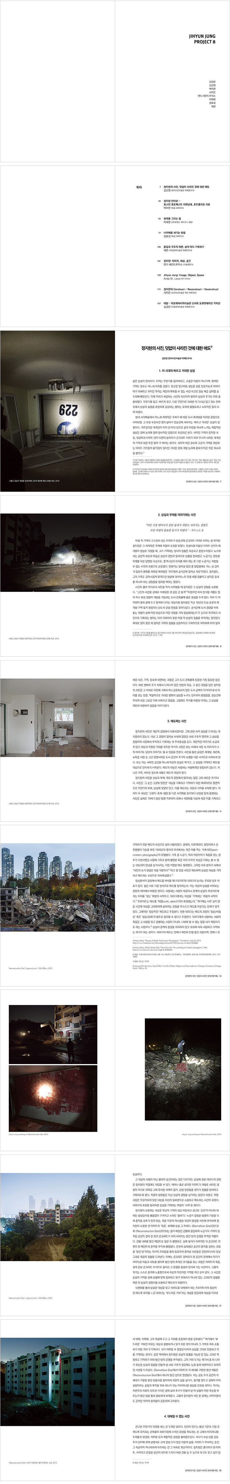건물이 사라지거나 탄생하는 현장에서 그 순간을 함께하며 건축물에 내재화된 물성을 이미지로 담아내는 사진 작가 정지현의 주요 프로젝트들을 담은 아티스트북이다. 철거 중인 아파트 건물 현장에서 비롯된 초기 작업부터 신용산 아모레퍼시픽미술관 신축 현장, 종로 3가 삼일빌딩 리모델링 과정, 3년간의 송은문화재단 신사옥 건설 현장 작업 등 작가의 주요 프로젝트들에 관한 이미지와 글들을 담았다.