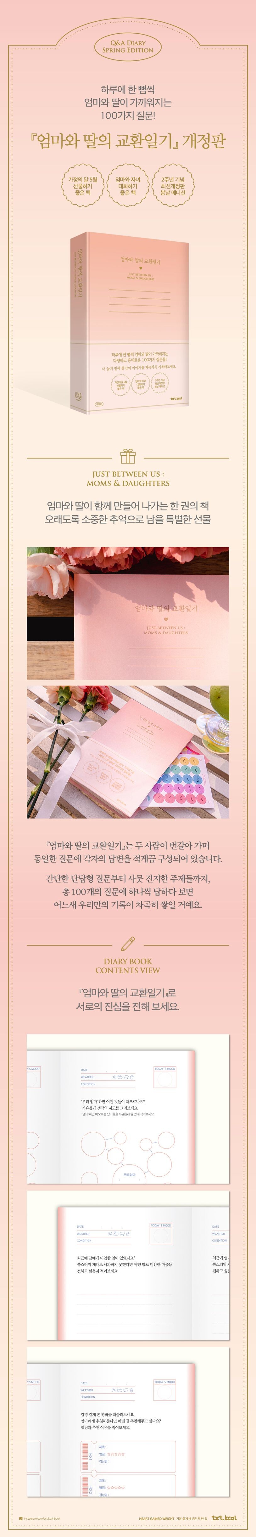 사랑과 감사의 달 5월을 맞이해 텍스트칼로리에서 『엄마와 딸의 교환일기』 개정판이 출간되었다. 엄마와 딸이 번갈아 가며 교환일기를 쓰듯, 같은 주제에 대해 엄마의 답변과 딸의 답변을 번갈아 가며 쓰는 구성으로 되어 있어서 서로의 생각을 한눈에 들여다볼 수 있다.