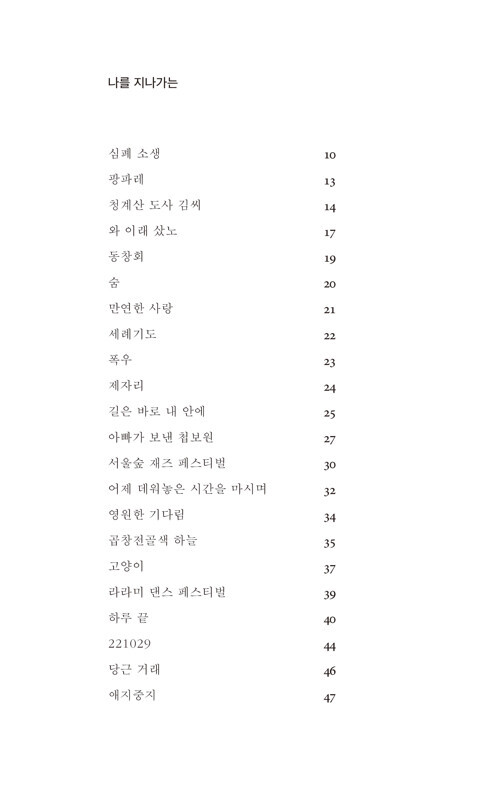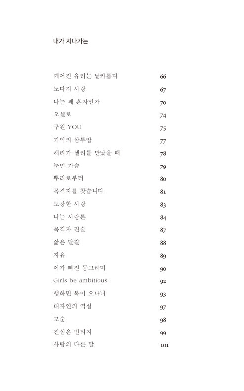 지금까지 김민혜의 일생 과정에 찾아오고 지나가는 것들의 이야기와 지나지 못한 것에 대한 마음의 고백이 있다.