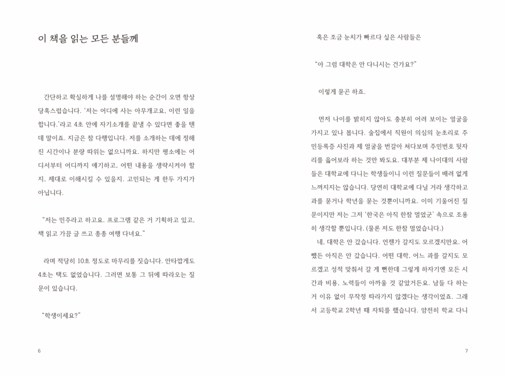 학교 밖 청소년, 대안 학교 수료생, 비진학 청년이자 기획자, 기록자, 여행자, 경험자의 정체성을 가진 사람의 이야기이다.