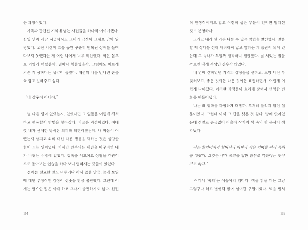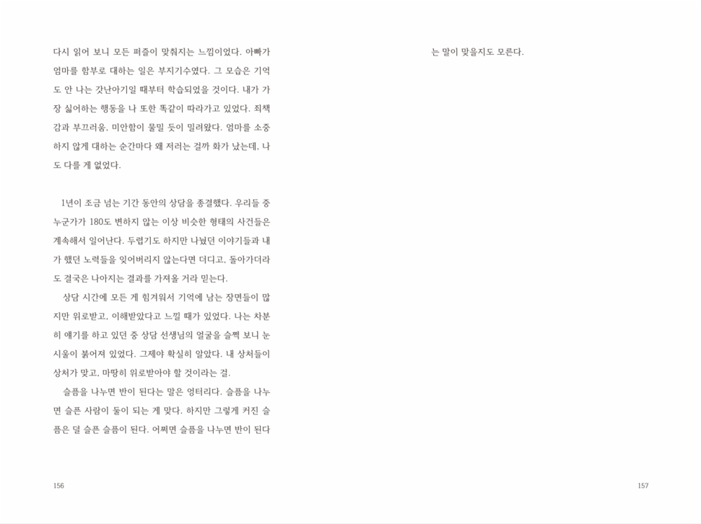막연함과 두루뭉술함에서 벗어나고만 싶었는데 애써 명확해지려 하지 않아도 괜찮다는 것과 이렇게 저렇게 설명하다 보면 그중에서도 반복되는 단어들이 자연스럽게 나를 표현해 준다는 것을 알았다. 절대 달라지지 않을 거라 생각했던 것도 어느새 다른 모양으로 변해있고, 옳다고 생각했던 것들도 꼭 그렇지만은 않다는 걸 느꼈다.