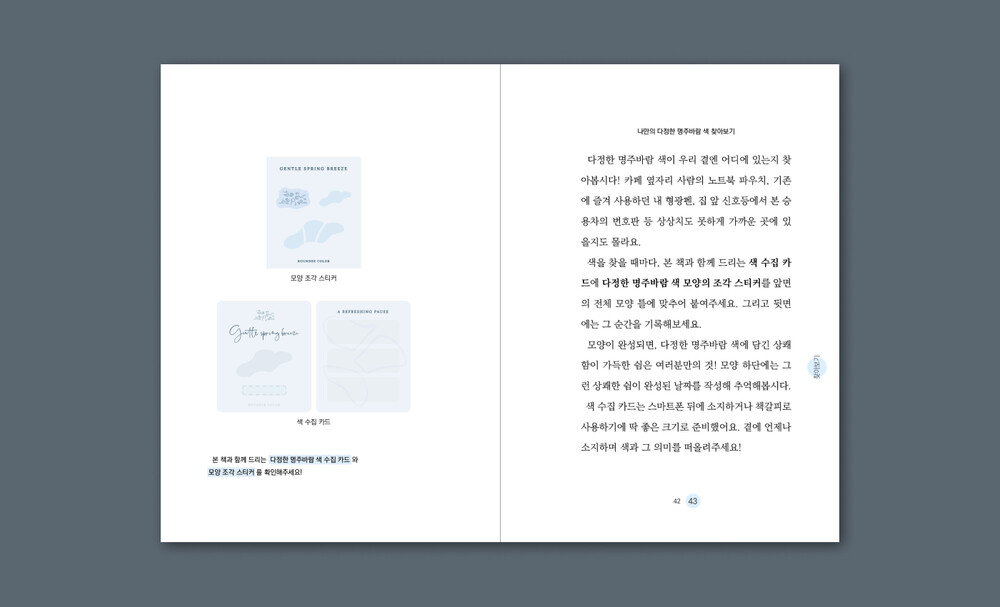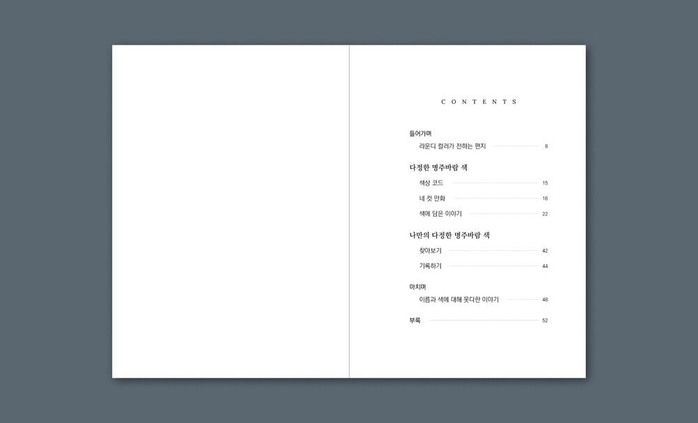 내용은 아트북 형태로, 줄글과 만화, 워크북 등으로 다양하게 구성했어요. 한 손에 들어갈 만큼 작고 가볍지만, 내용은 무겁게 그리고 알차게 준비했습니다. 색 이야기를 충분히 음미하실 수 있도록, ‘색상 수집 카드’와 ‘리무버블 색상 스티커’를 함께 드려요. 색 이야기를 읽은 뒤에, 주변에서 해당 색을 찾아 여러분 곁의 해당 색을 수집해보세요.