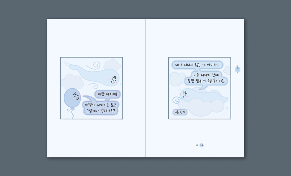 혼자 고뇌에 갇혀 헤매고 있는 내가 답답했는지, 환기 좀 하라고 바람이 멈춰 세운 모양이다. ‘잠깐 숨 좀 돌려!’ 하며. 잠시 고민을 내려놓고 넓은 하늘만을 떠올리며, 숨을 크게 들이켰다가 후-하고 내쉰다. 의식적으로 숨을 쉰 게 얼마 만인지, 안개가 낀 것 같았던 머릿속이 순식간에 맑아진다. 그런 뒤에 해결되지 않던 일을 다시 들여다보니, 마침내 방안이 보인다.