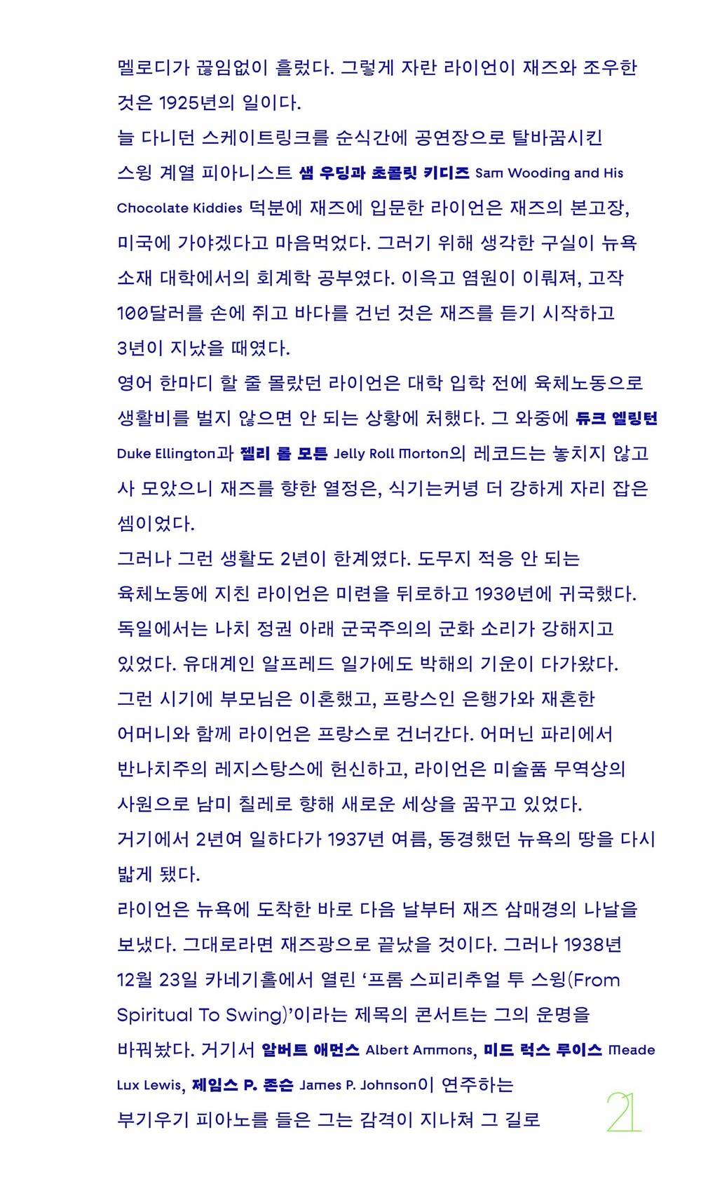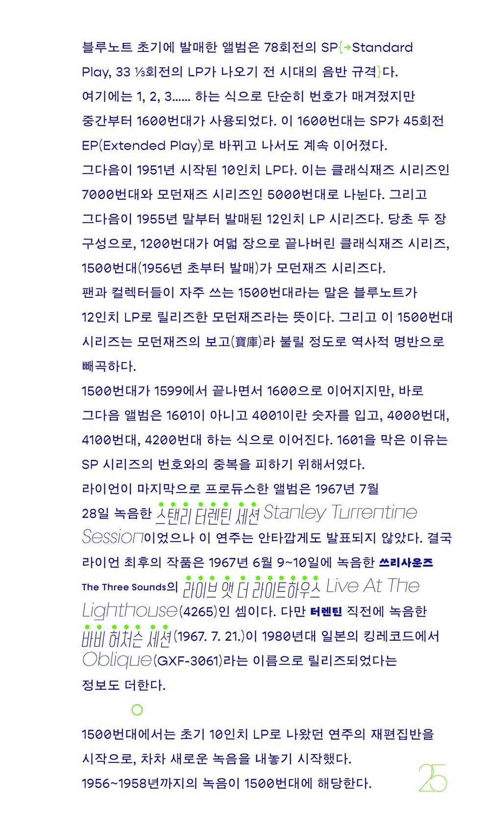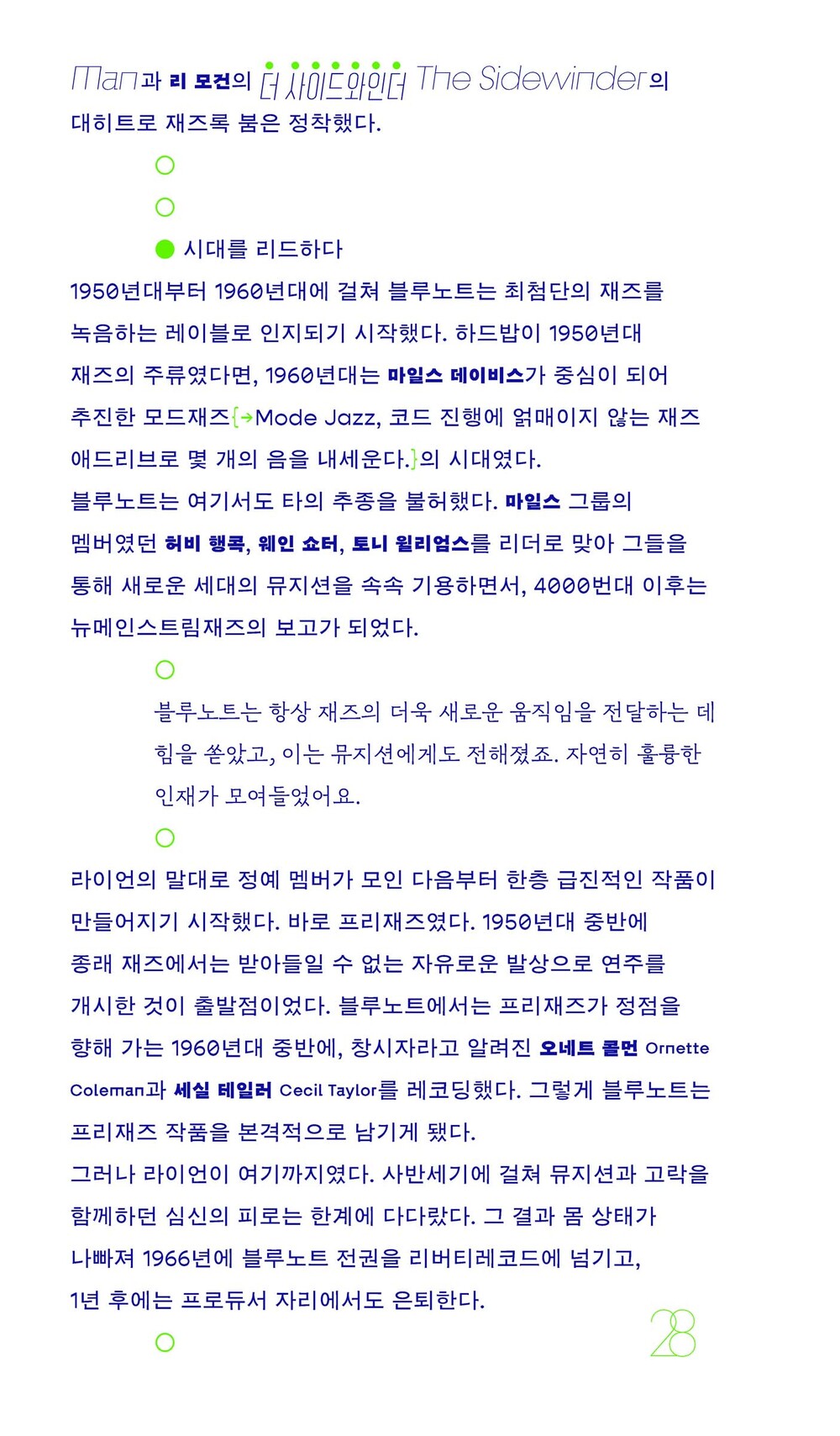 본문은 재즈처럼 흘러가도록 여러 서체를 쓰되 어우러지게, 무엇보다 뮤지션과 음반 타이틀이 한눈에 들어오도록 디자인했다.