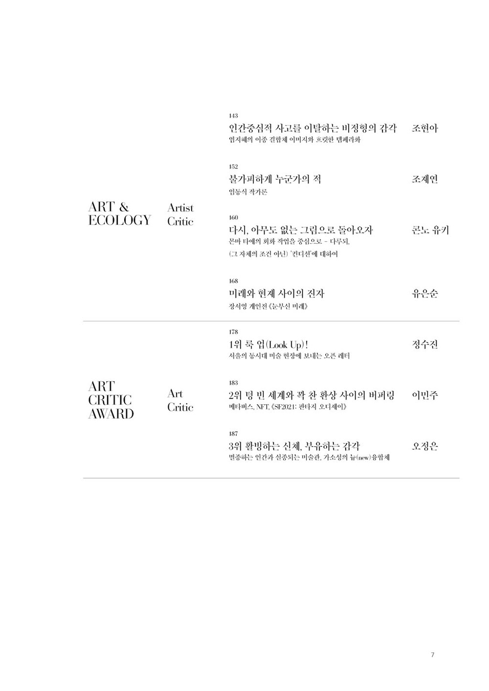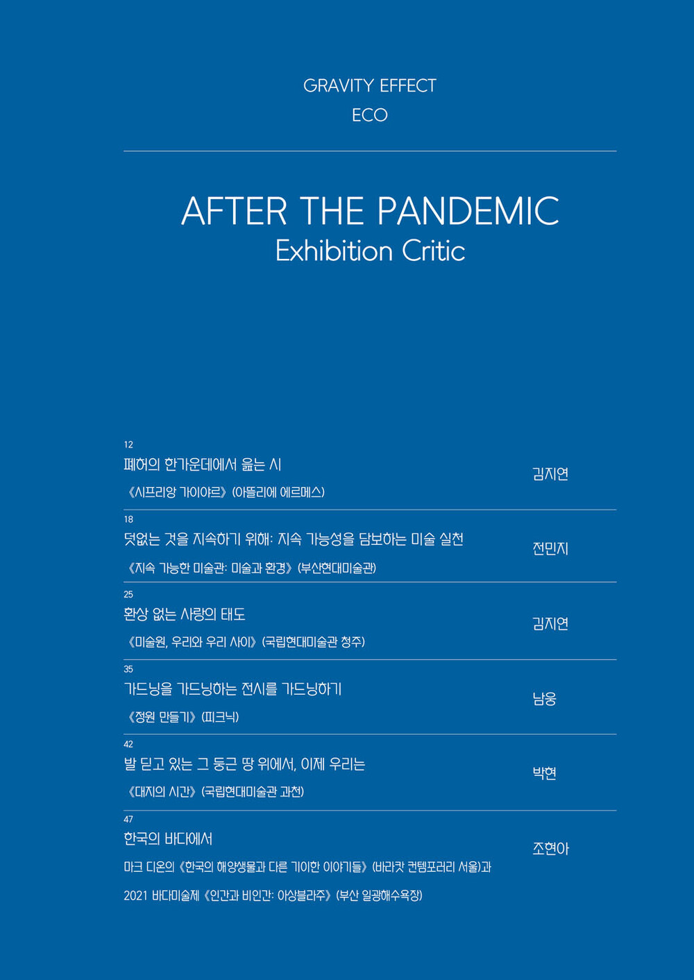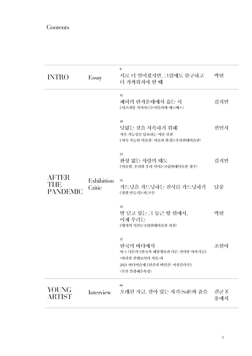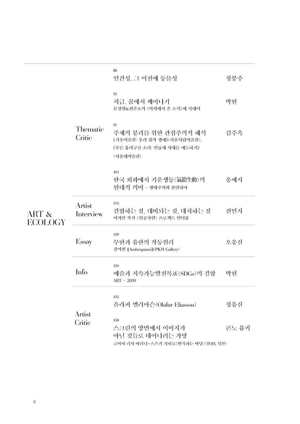 이러한 미술 현장에서 활발히 활동하고 있는 필자들은 위기에 처한 현재 상황에서, ‘예술이 급변하는 사회 안에서 무엇으로 기능할 수 있을지’에 대해 자신들만의 날선 시선을 이번 호에 담았다.