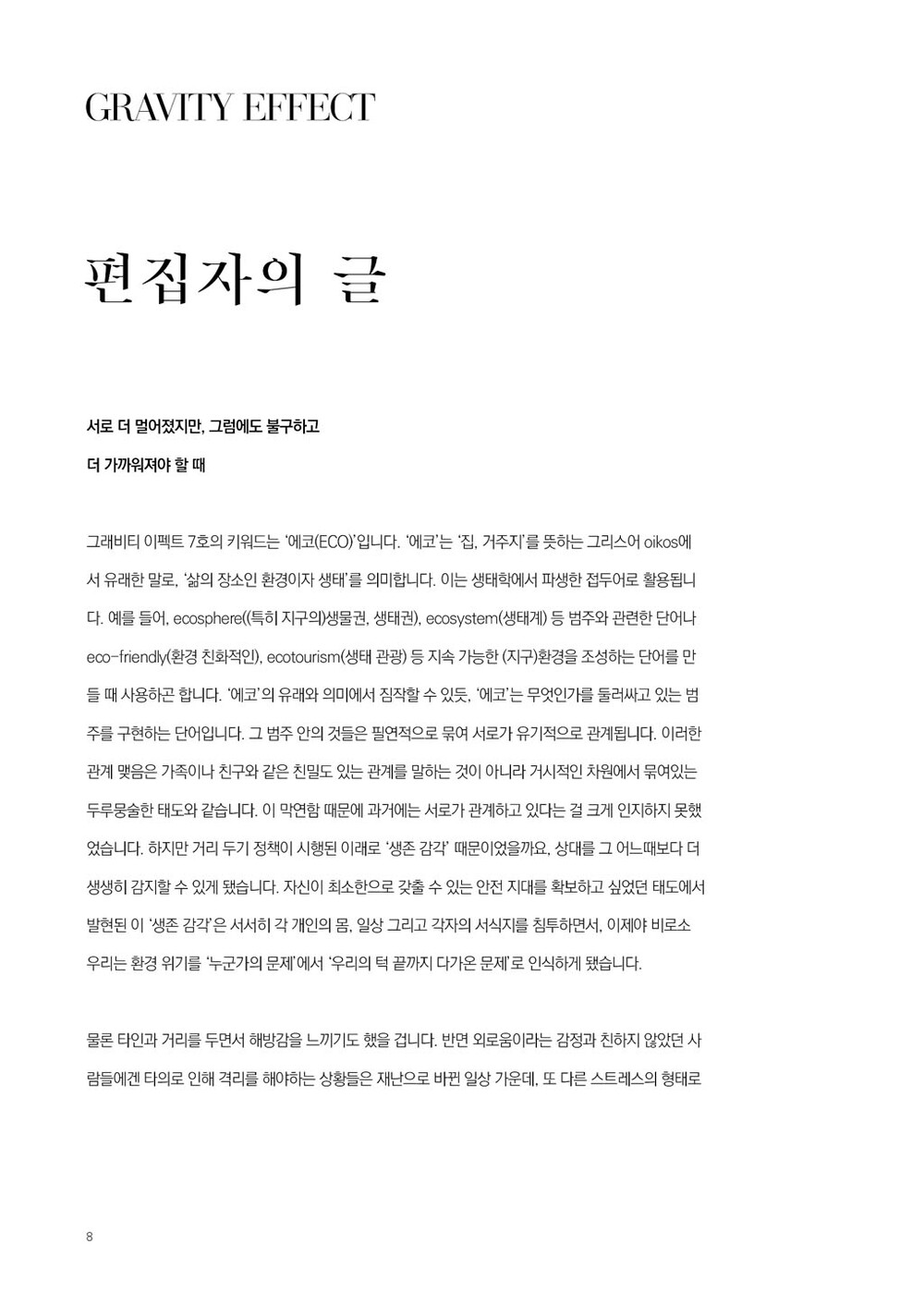동시대 미술의 현장을 반영한 키워드에 따라 엮어온 그래비티 이펙트 7호의 이번 키워드는 ‘에코(ECO)’이다. ‘에코’는 ‘집, 거주지’를 뜻하는 그리스어 oikos에서 유래했으며, 이는 무엇인가를 둘러싸고 있는 범주를 의미한다.