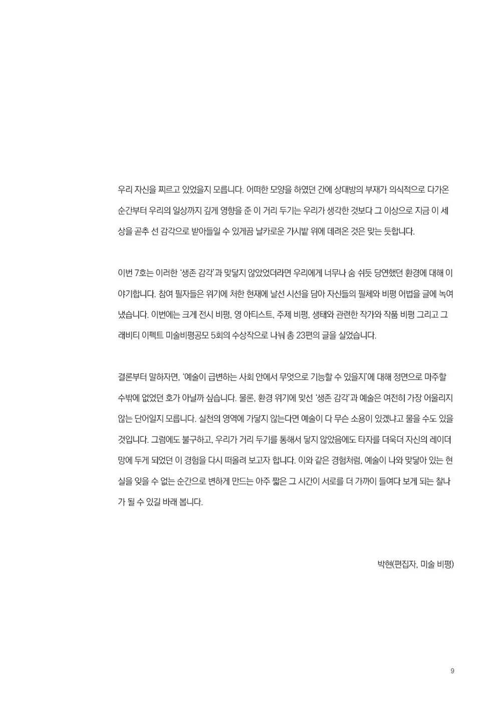 예술이 나와 맞닿아 있는 현실을 잊을 수 없는 순간으로 바꾼 그 장면들을 이번 호를 통해 접하며, ‘환경’이라는 범주 안에서 서로가 서로를 더욱 가까이 들여다볼 수 있는 시간이 되길 기대한다.