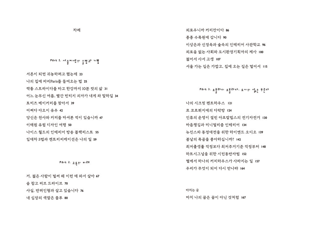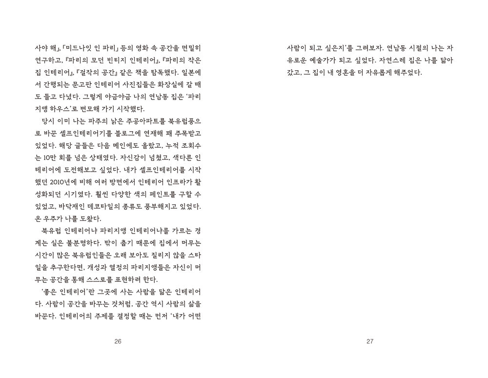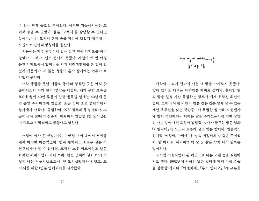 저자의 시절의 집과 인테리어를 함께 둘러보는 여정은 때로는 애틋하고, 때로는 무척이나 근사합니다. 사업에 실패해 빈털터리였던 시절, 젠트리피케이션에 쫓겨 정든 곳을 떠나야만 했던 시절을 지나, 작은 다락과 정원이 있는 이층집에 오기까지 지난날들을 담담히 풀어내는데요. 지난한 시간을 통과하면서도 시종일관 자신만의 유머와 취향을 잃지 않으려고 최선을 다합니다. 마음껏 꿈꾸며 상상의 나래를 펼치기도 하고, 다시 현실 한 가운데 선 자신을 똑바로 마주하며 더 나은 자신과 공간을 위해 발을 내딛습니다. 책을 통해 저자는 결국 ‘인테리어’란 나와 나의 공간을 돌보는 일임을, 나아가 삶을 돌보는 일임을 일깨워 줍니다. 오늘도 최선을 다해서 한 사람분의 삶을 살아내고 있는 모든 1인 도시생활자들에게 이 책을 추천합니다.