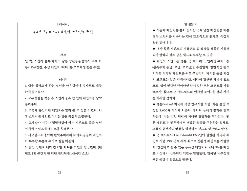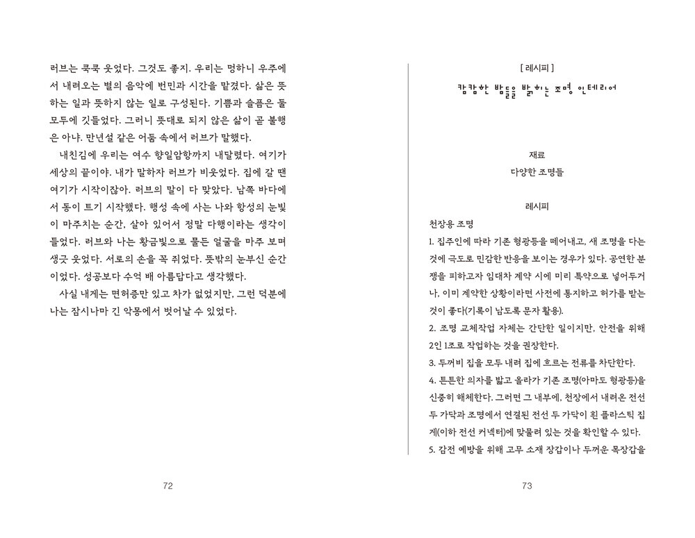저자가 말하는 인테리어 레시피는 큰돈을 들이지 않고, 크게 수고스럽지도 않으며, 누구의 도움도 필요 없이 오로지 1인이 해낼 수 있는 동시에 충분히 일상을 환기합니다. 그런데 여기에는 어딘가 다르고 특별하며 재미있는 포인트가 있습니다. 이를테면 이런 식입니다. 수목원에 다녀온 이야기를 하고 나서 우드 데코타일 설치법을 알려준다든지, 까만 밤하늘 아래서 바다를 향해 달렸던 지난한 어느 날을 떠올렸다가 조명을 활용한 인테리어를 설명합니다. 책과 인연이 깊었던 한 시절을 들려주고는 저렴한 목재를 사서 책장 만드는 법을 소개하기도 하고요. 이 책엔 거창한 도면도 사진도 없지만, 조곤조곤 건네는 작가의 말을 따라가다 보면 누구든 나만의 취향을 반영한 셀프 인테리어에 도전할 수 있습니다. ‘인테리어’라면 어쩐지 고가의 장비를 동원하여 리모델링을 하고, 북유럽풍의 빈티지 가구나 값비싼 소재의 모듈 가구를 놓아야 할 것만 같은 일종의 편견을 톡톡 깨트리지요. 환하게 웃던 어느 날은 가구 배치를 바꾸고, 화내고 좌절하던 날은 문고리를 바꾸고, 또다시 힘을 내던 어느 날은 벽에 페인트를 색칠하며. 그렇게 가끔 무너지면서도 다시 일어나 한 걸음씩 옮겨, ‘꼭 1인분만큼의 인테리어 레시피’로 삶과 집 그리고 자신을 돌봅니다.