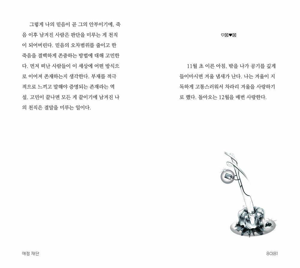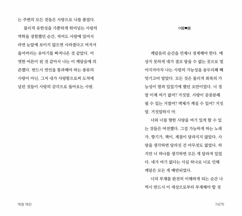 다만, 우리가 이 세상에서 전부 말끔히 사라진 이후에도 남는 것이 있다면 우리 가 또는 우리를 애정했던 것들이다. (p.102)