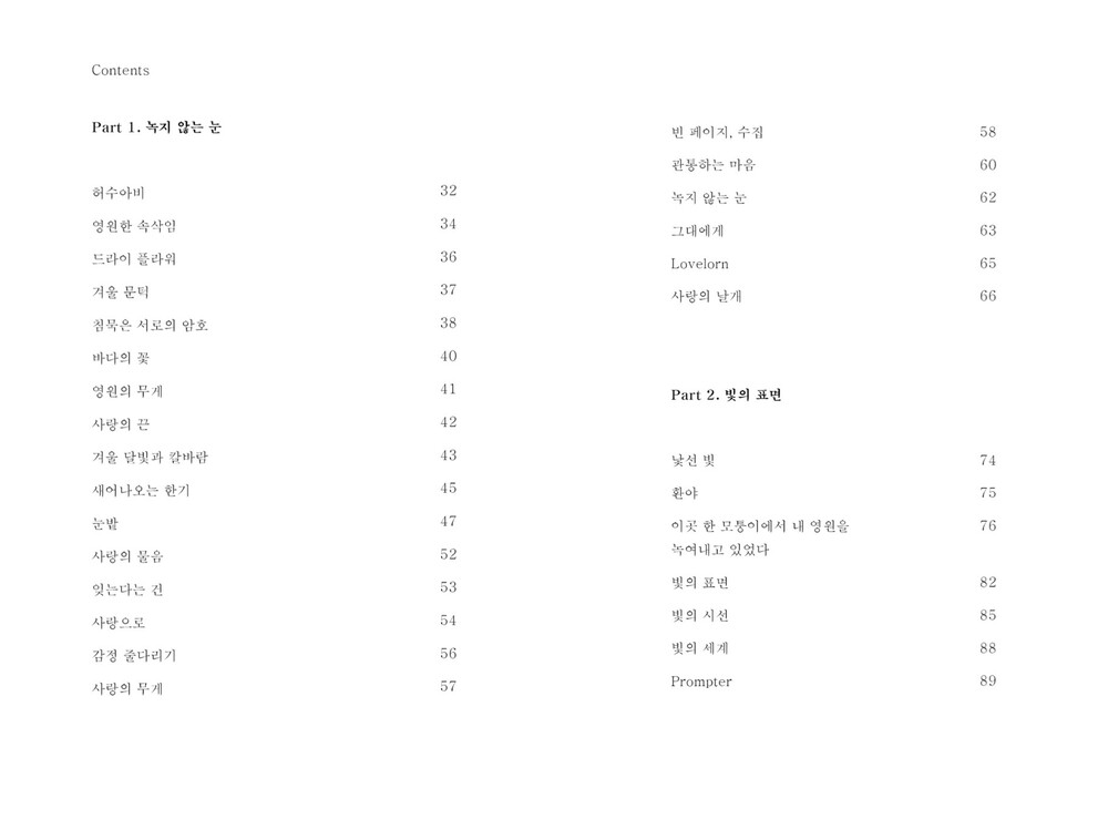 눈밭 47 / 사랑의 물음 52 / 잊는다는 건 53 / 사랑으로 54 / 감정 줄다리기 56 / 사랑의 무게 57 /