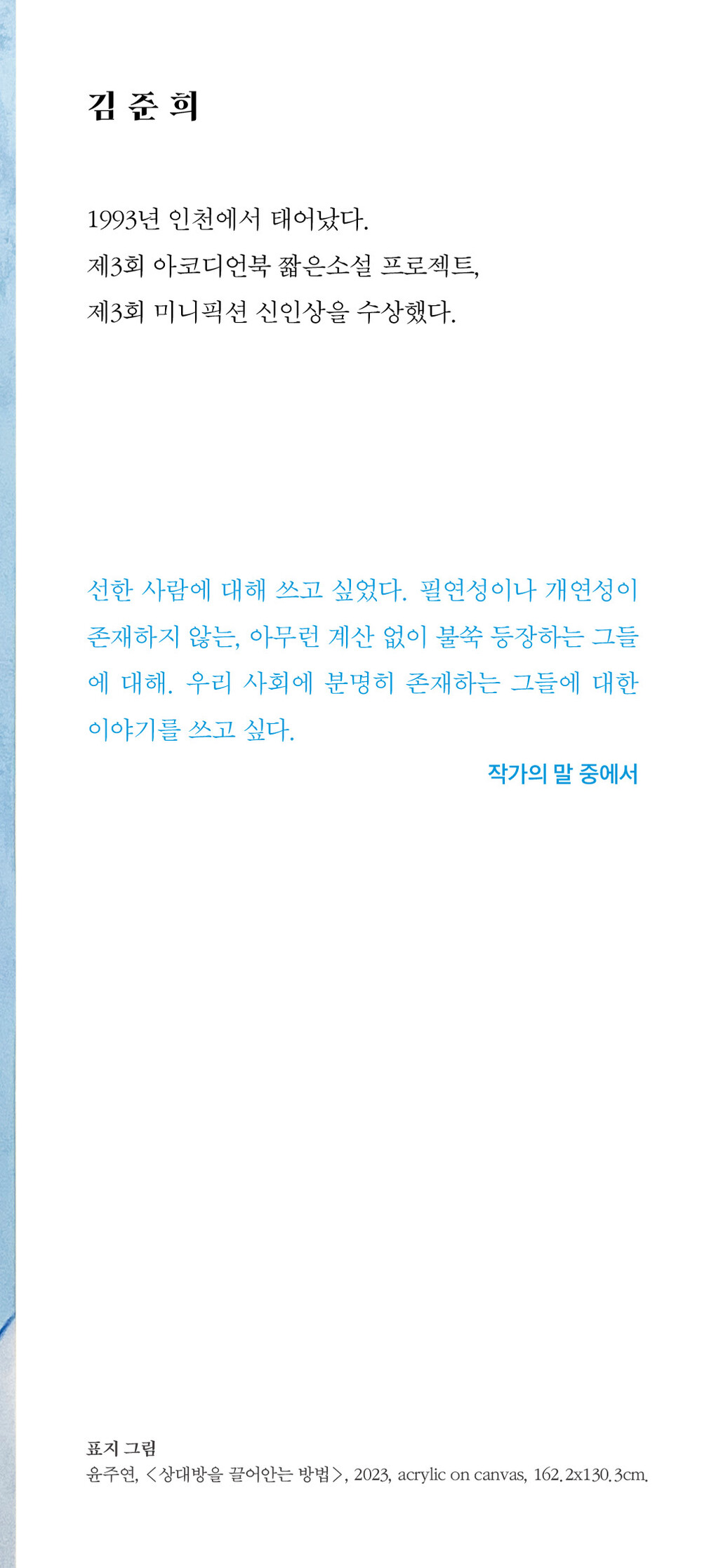 선한 사람에 대해 쓰고 싶었다. 필연성이나 개연성이 존재하지 않는, 아무런 계산 없이 불쑥 등장하는 그들에 대해. 우리 사회에 분명히 존재하는 그들에 대한 이야기를 쓰고 싶다.