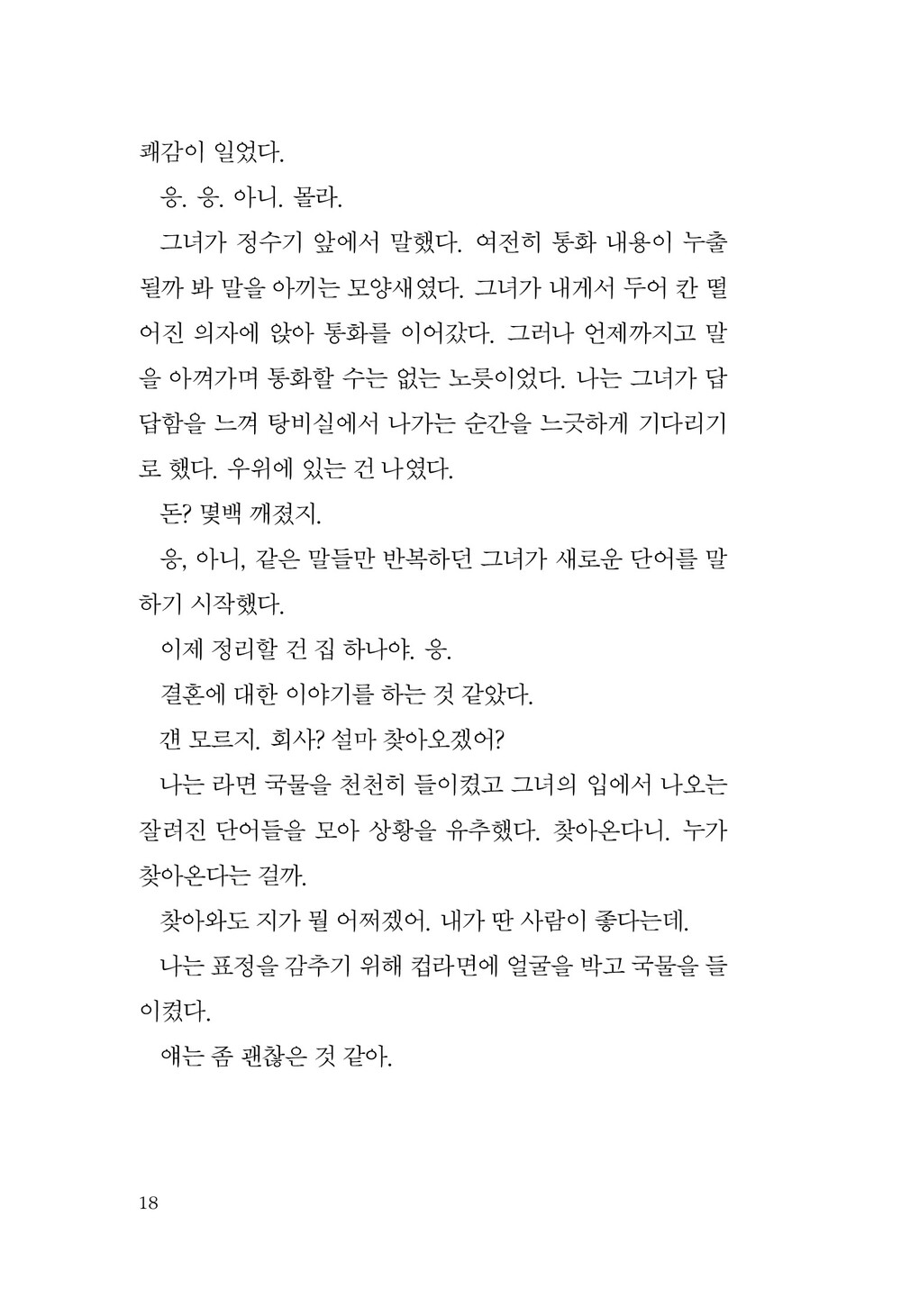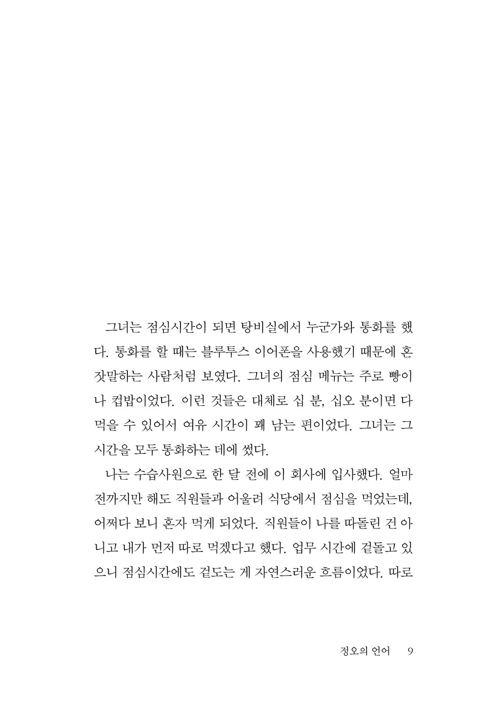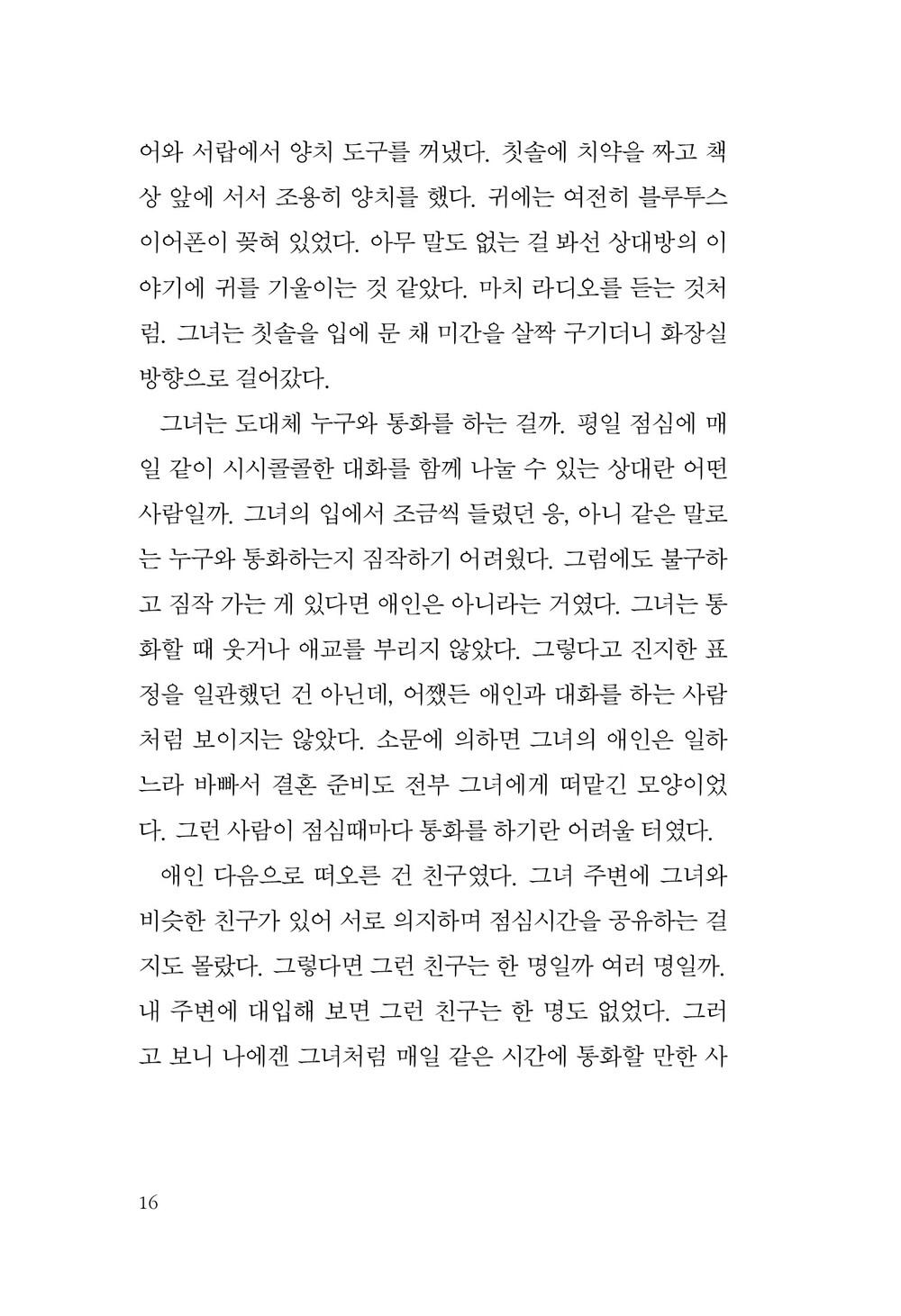 그녀는 점심시간이 되면 탕비실에서 누군가와 통화를 했다. 통화를 할 때는 블루투스 이어폰을 사용했기 때문에 혼잣말하는 사람처럼 보였다. 그녀의 점심 메뉴는 주로 빵이나 컵밥이었다. 이런 것들은 대체로 십 분, 십오 분이면 다 먹을 수 있어서 여유 시간이 꽤 남는 편이었다. 그녀는 그 시간을 모두 통화하는 데에 썼다.