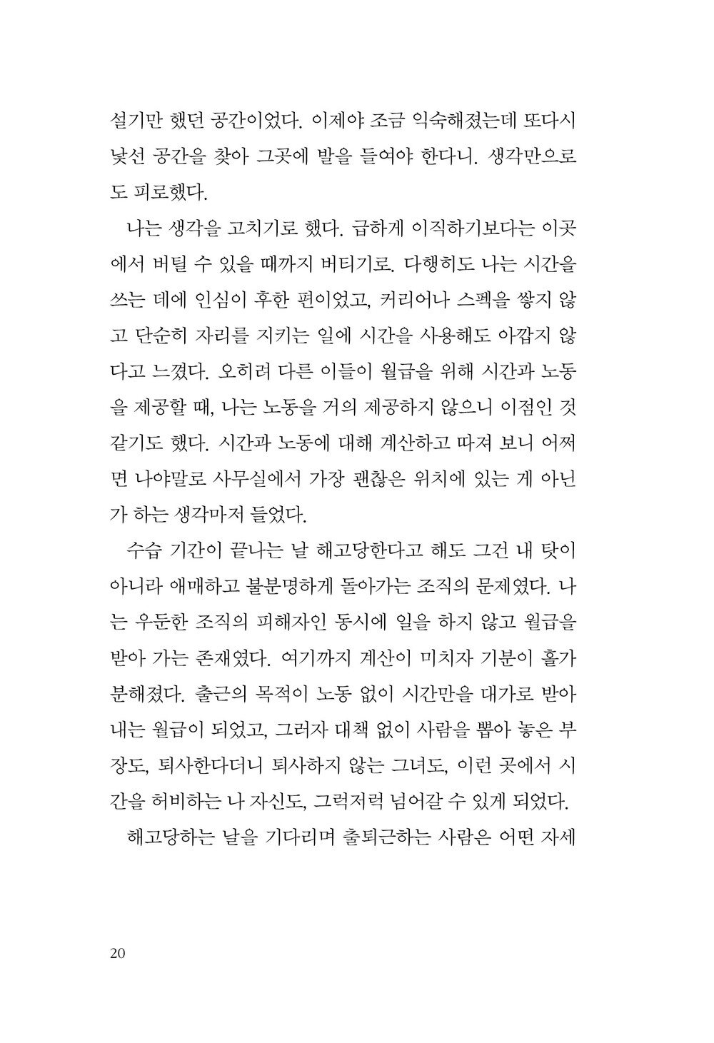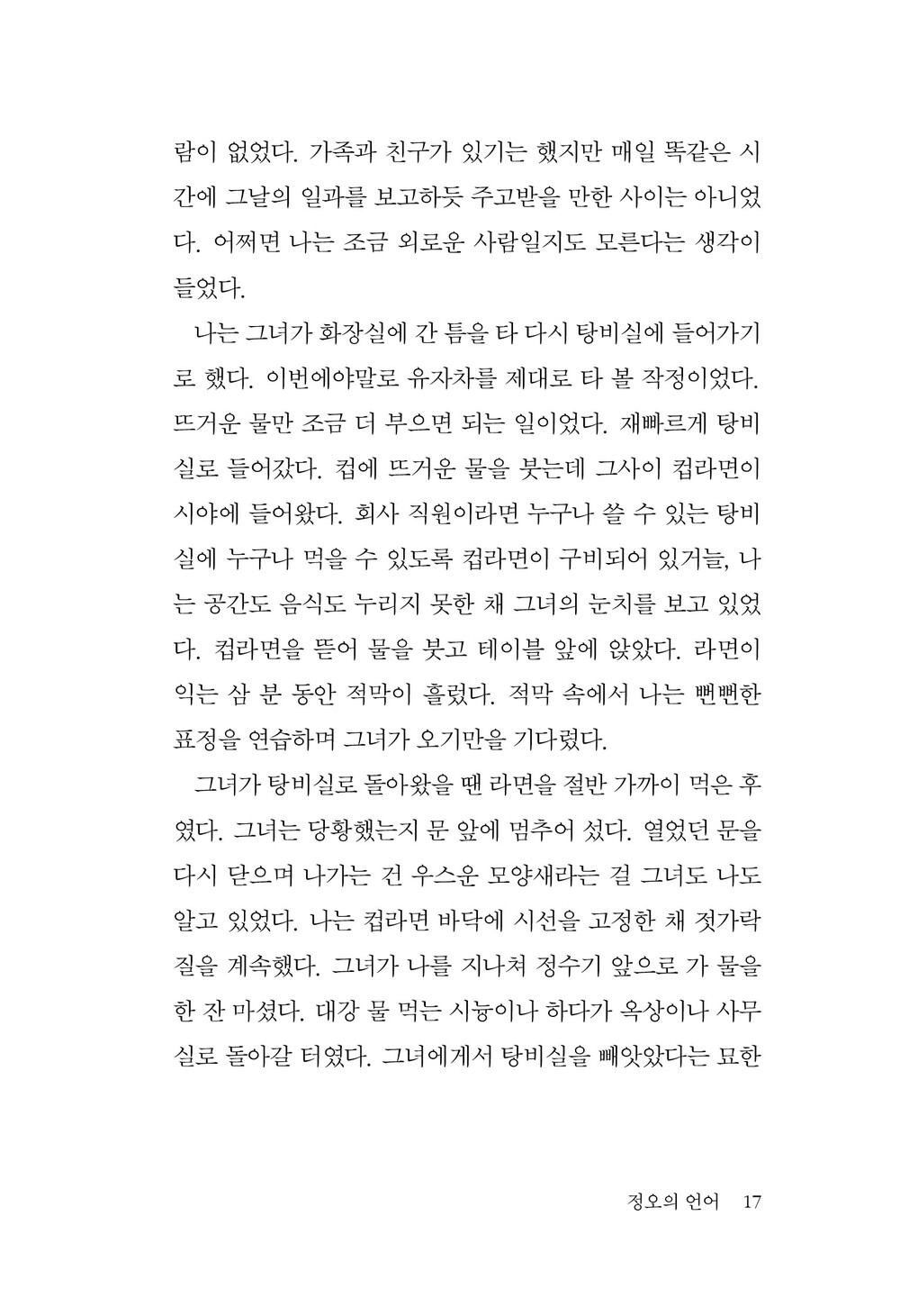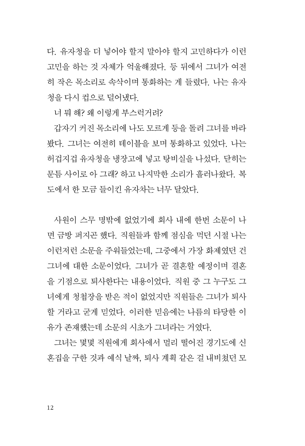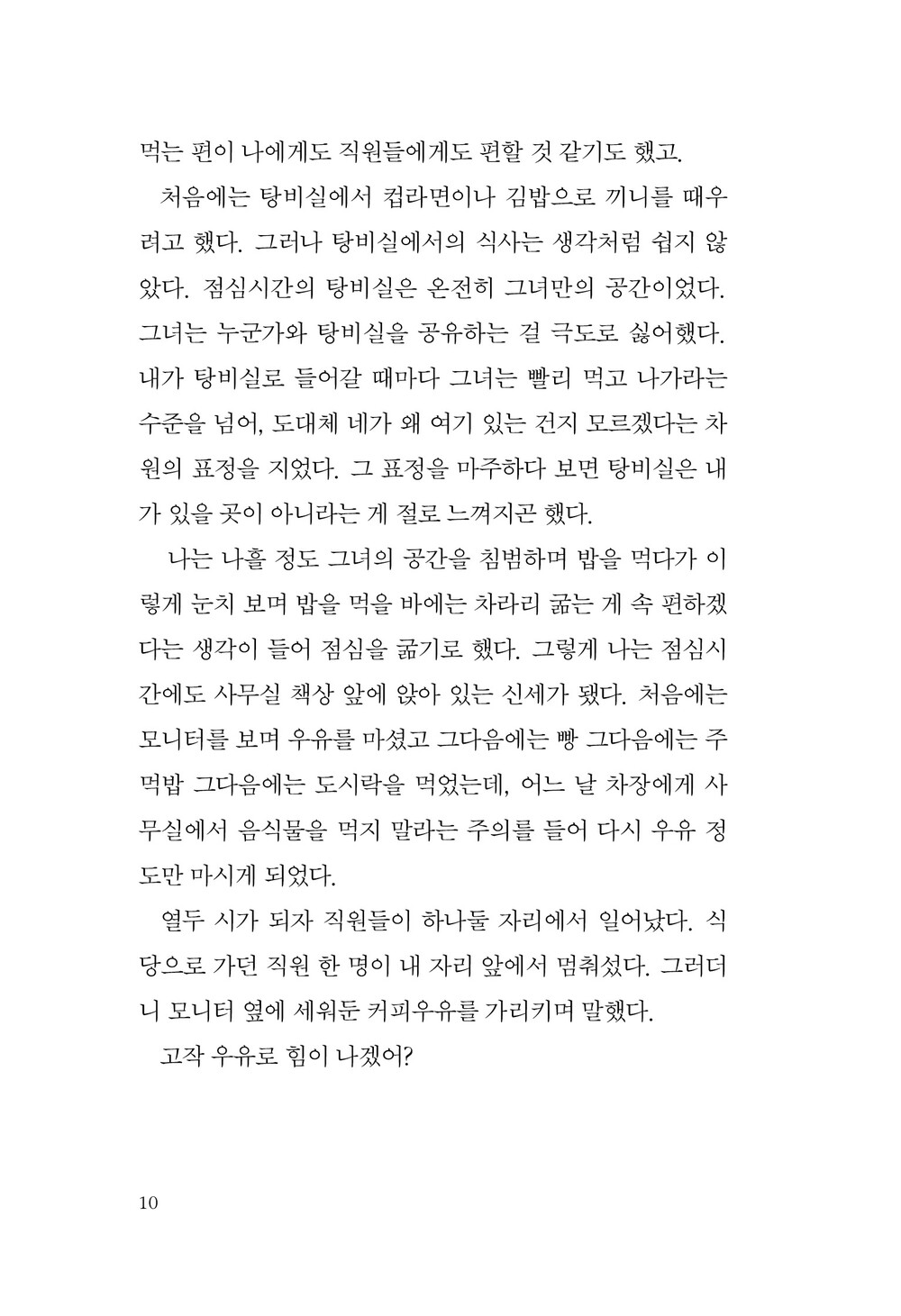 점심시간의 탕비실은 온전히 그녀만의 공간이었다. 그녀는 누군가와 탕비실을 공유하는 걸 극도로 싫어했다. 내가 탕비실로 들어갈 때마다 그녀는 빨리 먹고 나가라는 수준을 넘어, 도대체 네가 왜 여기 있는 건지 모르겠다는 차원의 표정을 지었다. 그 표정을 마주하다 보면 탕비실은 내가 있을 곳이 아니라는 게 절로 느껴지곤 했다.