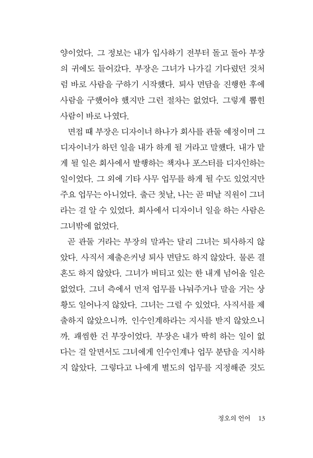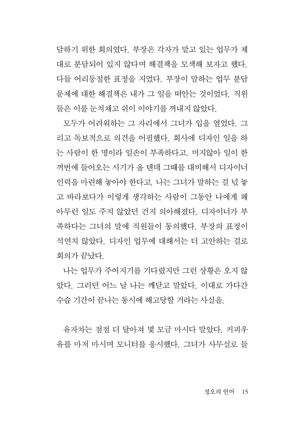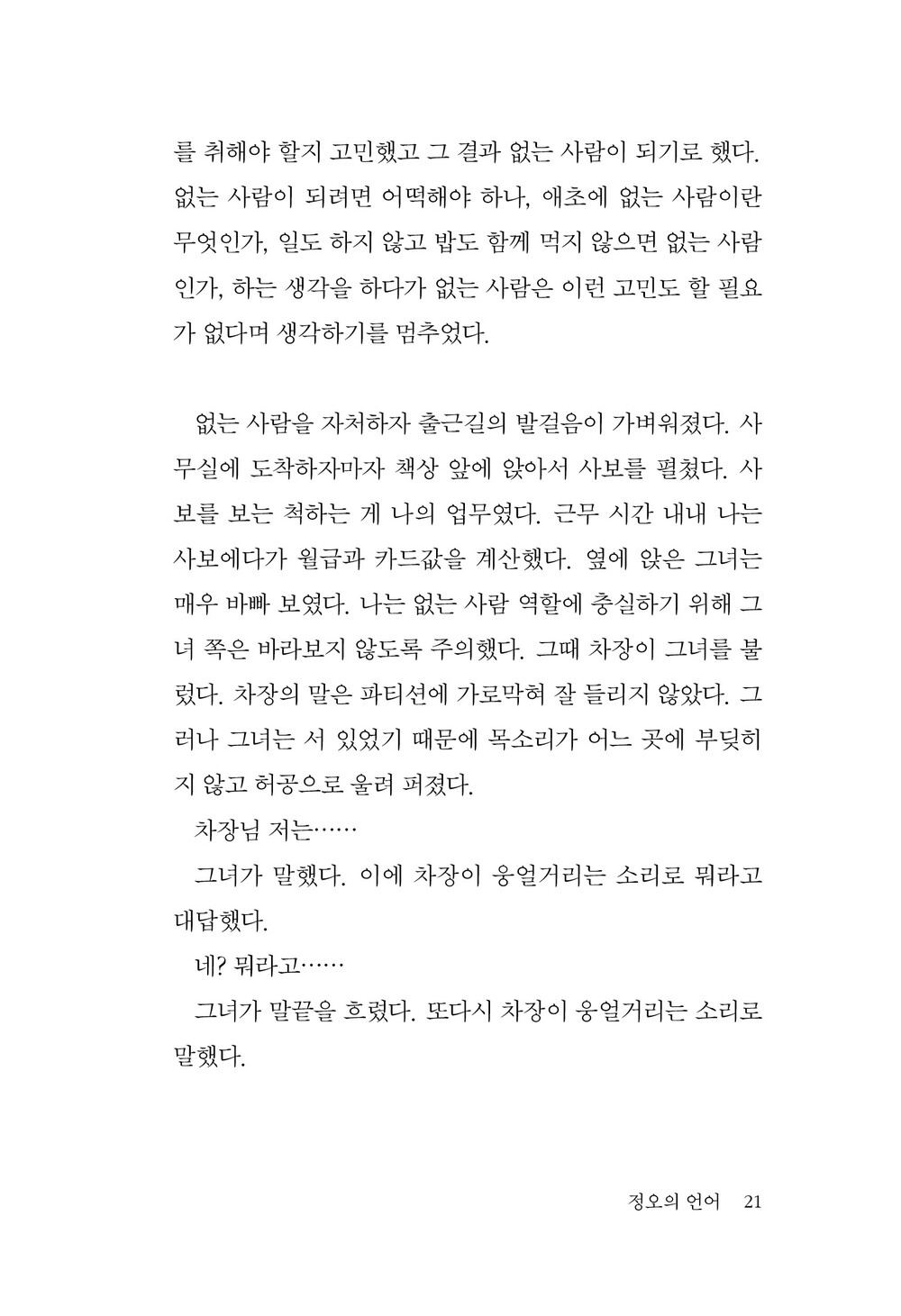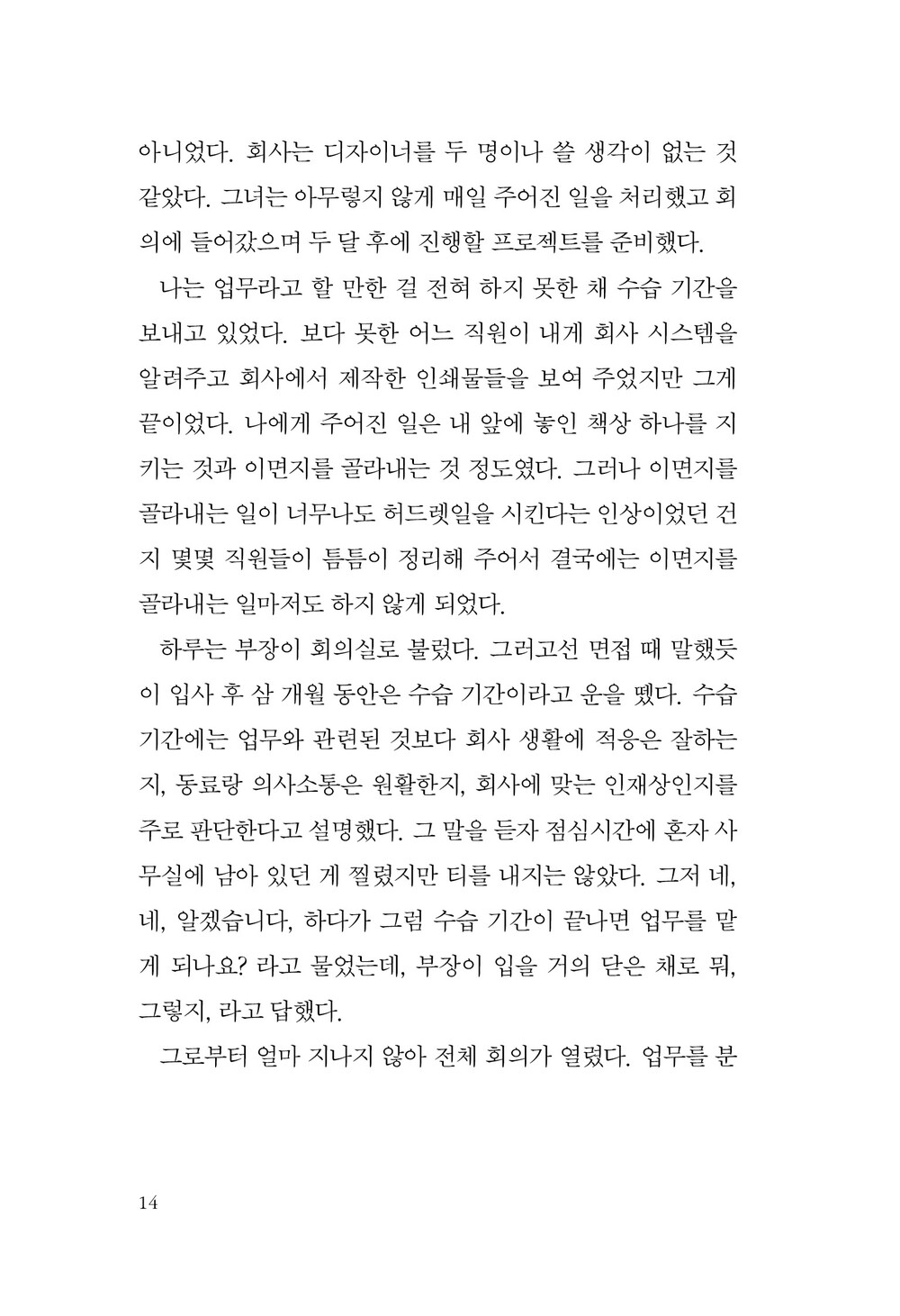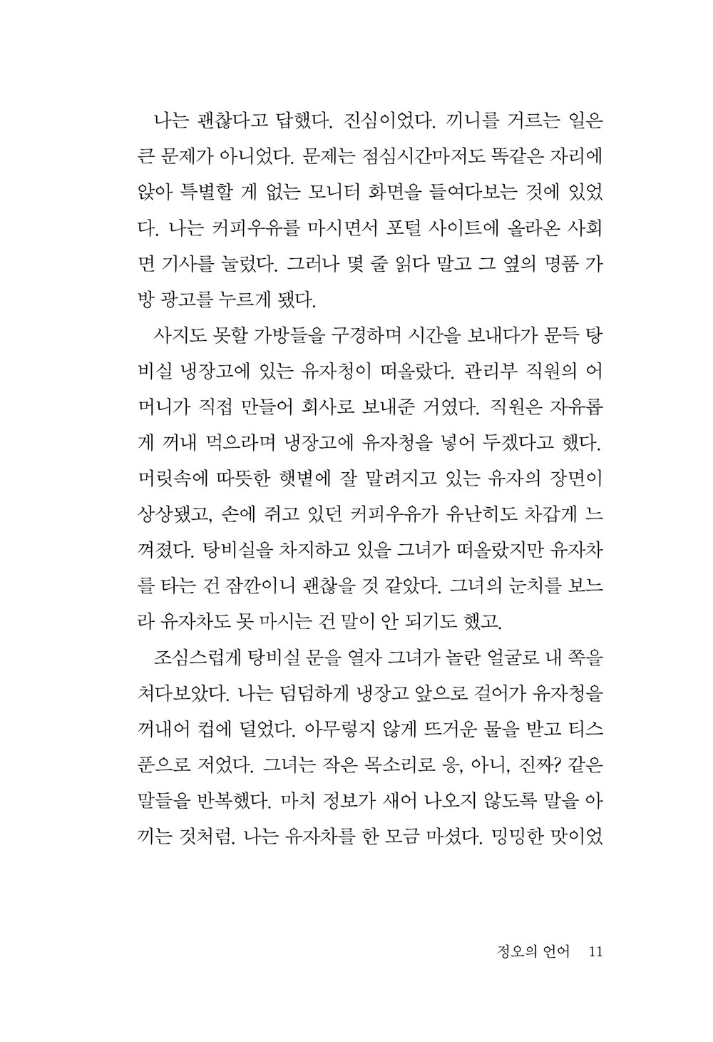 점심시간의 탕비실은 온전히 그녀만의 공간이었다. 그녀는 누군가와 탕비실을 공유하는 걸 극도로 싫어했다. 내가 탕비실로 들어갈 때마다 그녀는 빨리 먹고 나가라는 수준을 넘어, 도대체 네가 왜 여기 있는 건지 모르겠다는 차원의 표정을 지었다. 그 표정을 마주하다 보면 탕비실은 내가 있을 곳이 아니라는 게 절로 느껴지곤 했다.