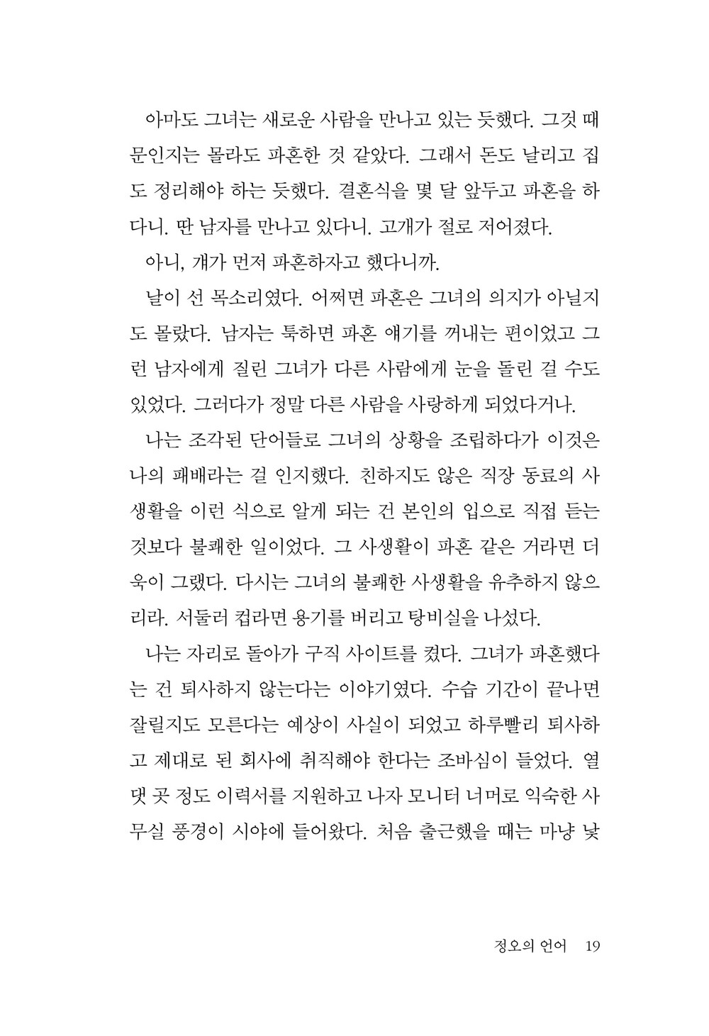 기차가 서울을 벗어날 때쯤 나는 왜 Y시에 가려고 하는 건지 생각해 보았다. 나는 건호에게 데뷔해야 한다고 호소하고 싶은 것도 아니었고 미쳤냐고 호통치고 싶은 것도 아니었으며 하염없이 거리를 떠돌다가 건호와 마주치는 우연을 바란 것도 아니었다.